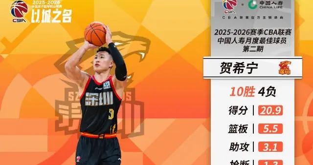 北京時間2月6日,CBA官方公佈了2025-2026賽季常規賽第二期月度最佳球員,深圳隊球員賀···