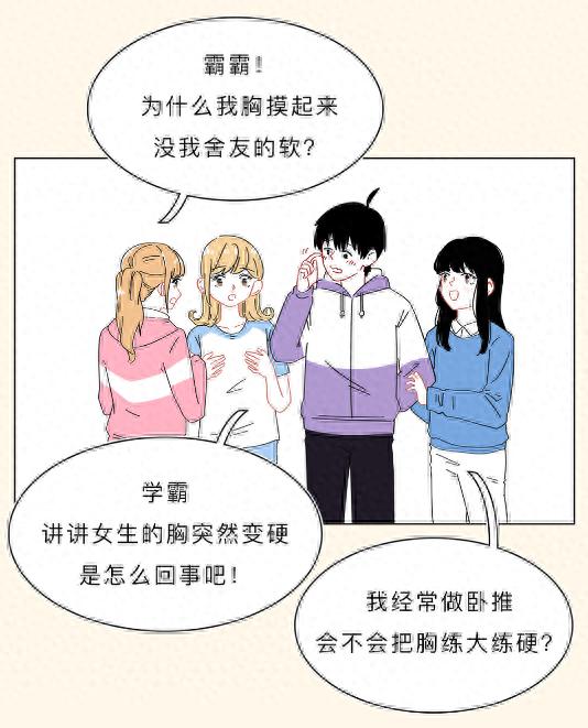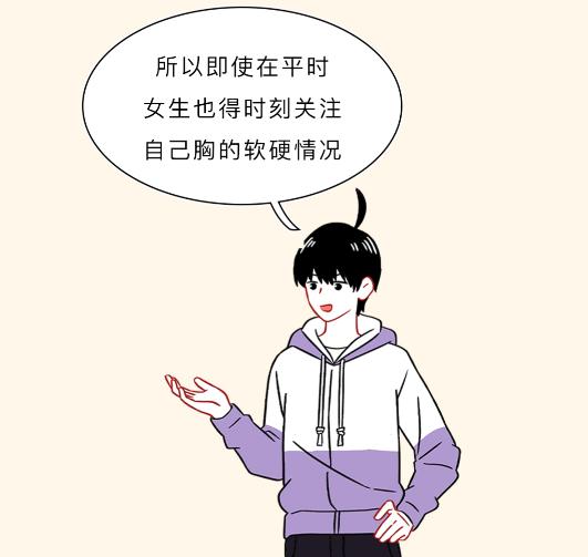 來源:學霸本霸 ID:yishen233 說起來你們可能不信很多女生都問過我類似的問題有些看到這個問題一頭霧水的男生也表達了他們的想法這樣吧既然大家都對這個問題有疑問那我只好勉爲其難替大家研究下其中的奧祕首先你們要只要女生的胸本來就是有軟有硬的脂肪量比較高的叫脂肪型胸屬於軟的而乳腺纖維組織多的是乳腺型胸就屬於硬的這兩種不同的胸型還會涉及到一個讓女生非常糾結的問題減肥具體點說就是脂肪型胸的女生減肥後隨着胸部脂肪的減少很容易會把胸減沒而乳腺型胸的女生減肥胸反而會越減越大不過除了這種胸不由你的情況外確實還有些其它時期女生的胸會一會兒軟一會兒硬我具體給你們分析下01胸變軟了短期內胸變軟了女生需要反思下自己最近做了什麼就像上面提到的脂肪是個非常柔軟的東西如果你變胖了脂肪堆積在胸上胸自然就會變得軟軟的如果女生的胸部乳腺萎縮失去彈性胸也會看起來變軟了只不過這種軟同時還會帶來另一個問題一般來說這種多半是因爲抽菸、喝酒或者上了一定的年級02胸變硬了青春期的時候女孩子的胸開始變大乳腺會在雌、孕激素的作用下增多變強所以這個階段胸經常能感覺到輕微的脹痛感屬於正常情況差不多經歷個3、5年等胸該長大的都大了脹痛感就會跟着消失姨媽期前的那幾天體內激素水平變高乳腺內細胞會變大、出現水腫胸自然就會有硬塊、脹痛的情況不過這種情況也不用慌等姨媽來了胸自然就會軟下去了有些特殊場景比如胸在受到外部刺激後也是會變硬的這個不用我多說大家也知道胸部是個非常敏感的地方但凡它受到一點刺激乳房血液循環增加、乳頭變硬胸部就會充血、變大不過等刺激結束這種虛空膨脹也就跟着消失了首先說一點上面提到的幾種變硬的情況如果不是脹痛的很厲害一般問題不大但如果你們確實胸部老有個腫塊長着不消那就值得注意了很多20-25歲左右的女生由於性激素水平的異常可能會得一種叫乳腺纖維腺瘤的乳腺疾病這個腫塊平時不痛不癢如果不是經常摸到很多女生都會把它當成普通的乳腺結節置之不理但是一旦讓它長到了一定大小就必須靠手術取出了好了關於女生胸軟硬的情況我講的差不多了總之這事兒沒啥好大驚小怪的你們去看看男生的胸不也有時軟有時硬嘛