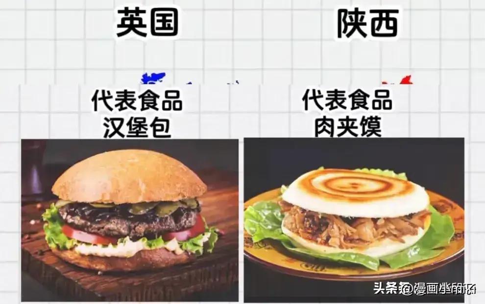 英國代表食品漢堡包,陝西代表食品肉夾饃。這兩個就是一回事呀