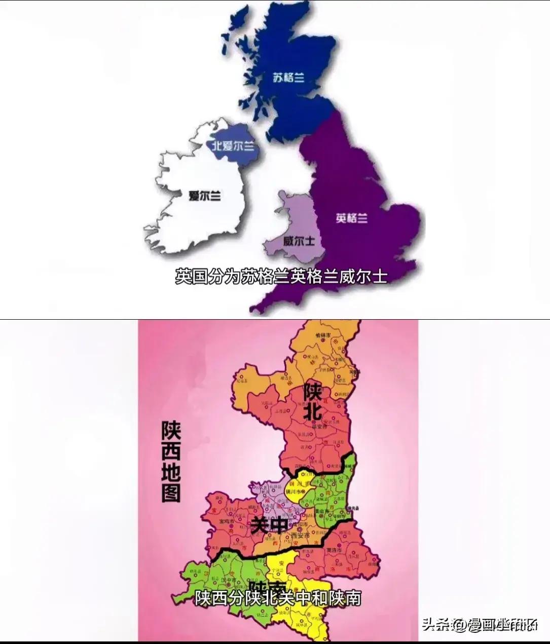 英國本土分爲蘇格蘭、威爾士、英格蘭,三個地方誰也不服誰;陝西分爲陝北、陝南、關中,三個地方也相互看不慣。
