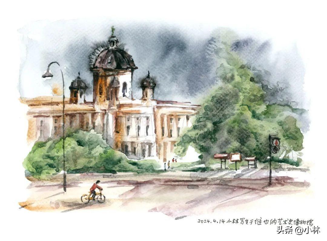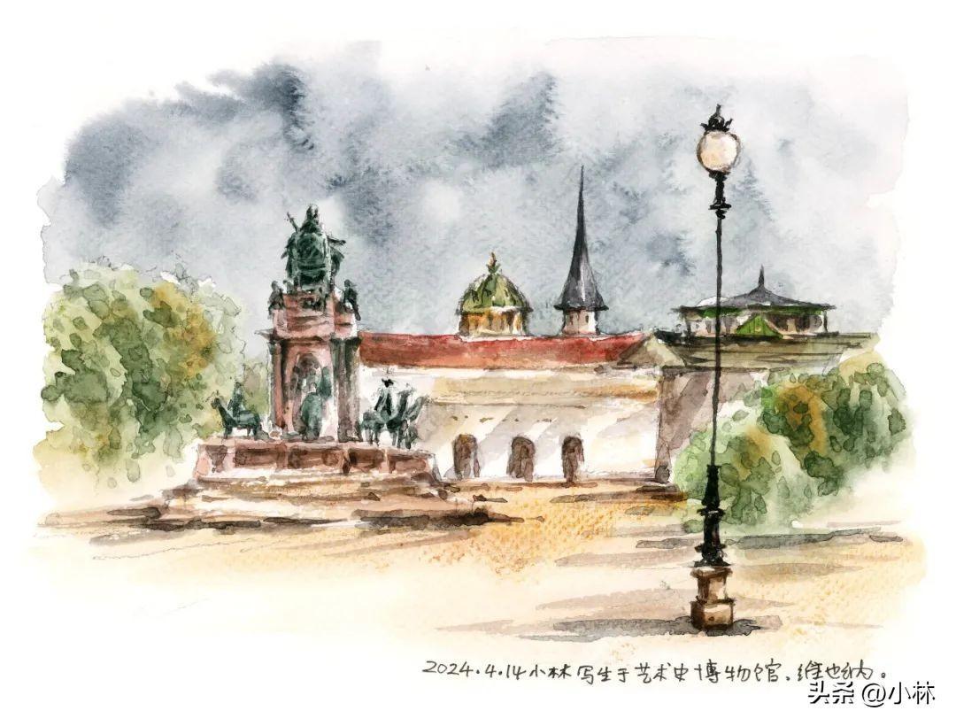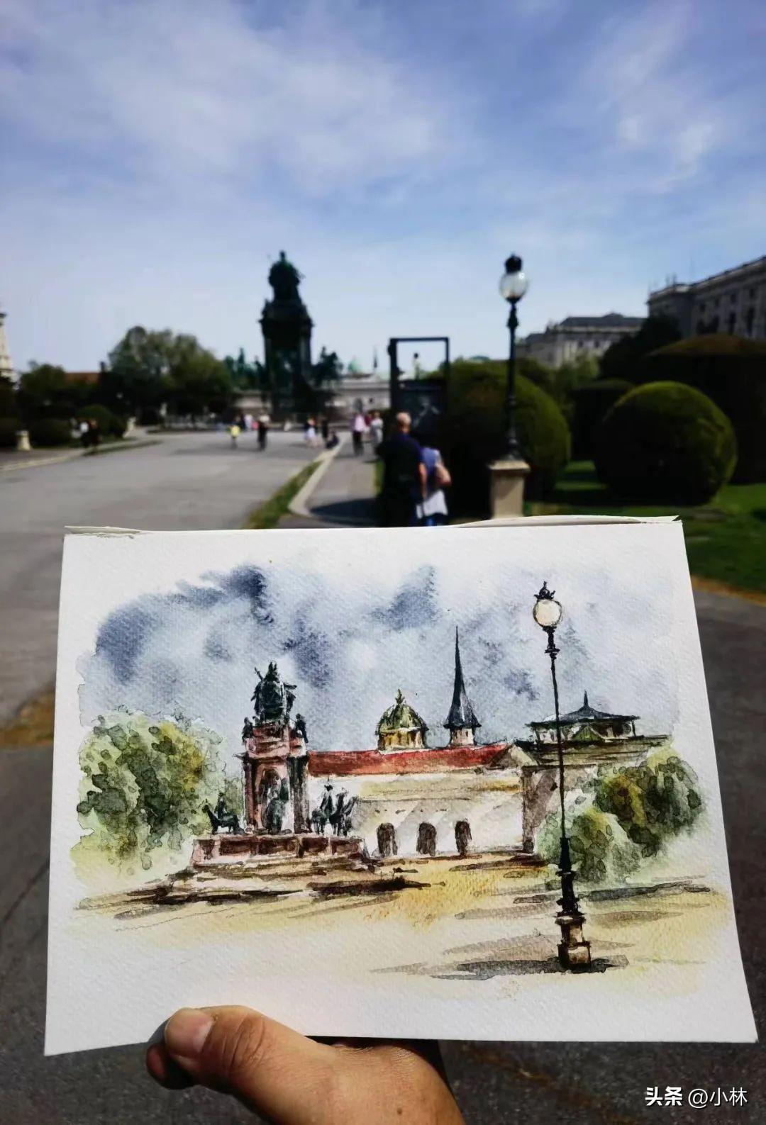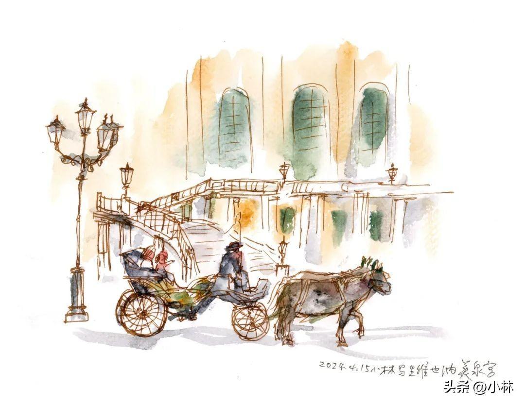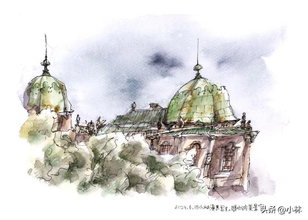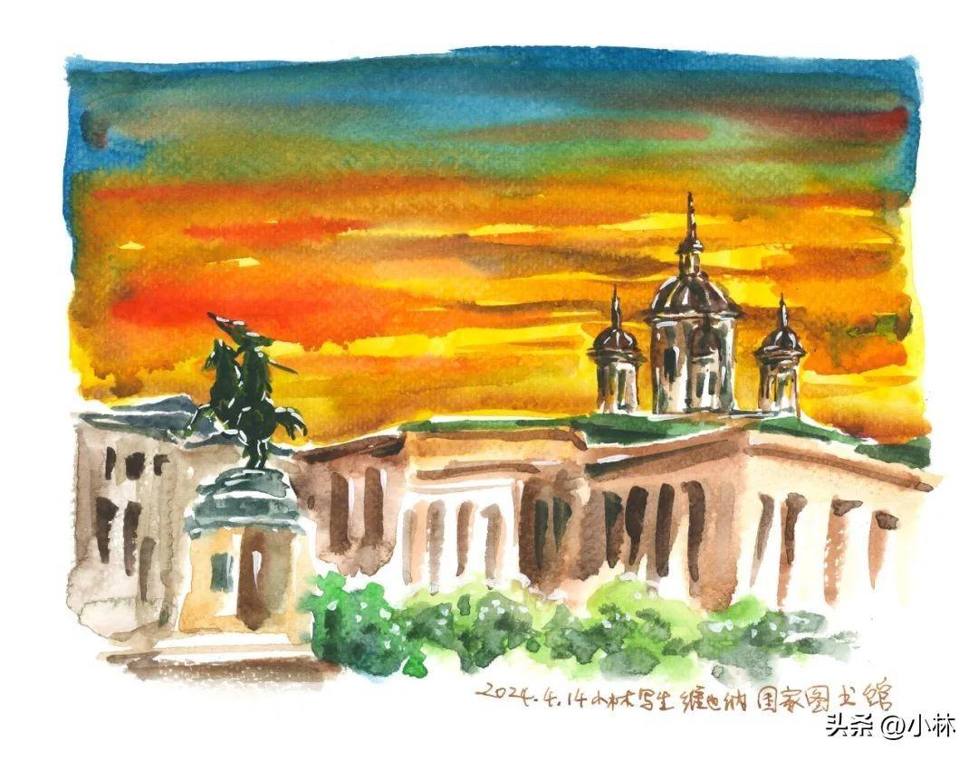 夕陽裏,路過維也納國家圖書館,十分鐘畫完這張寫生。