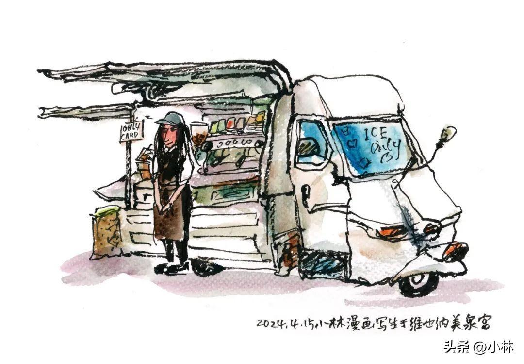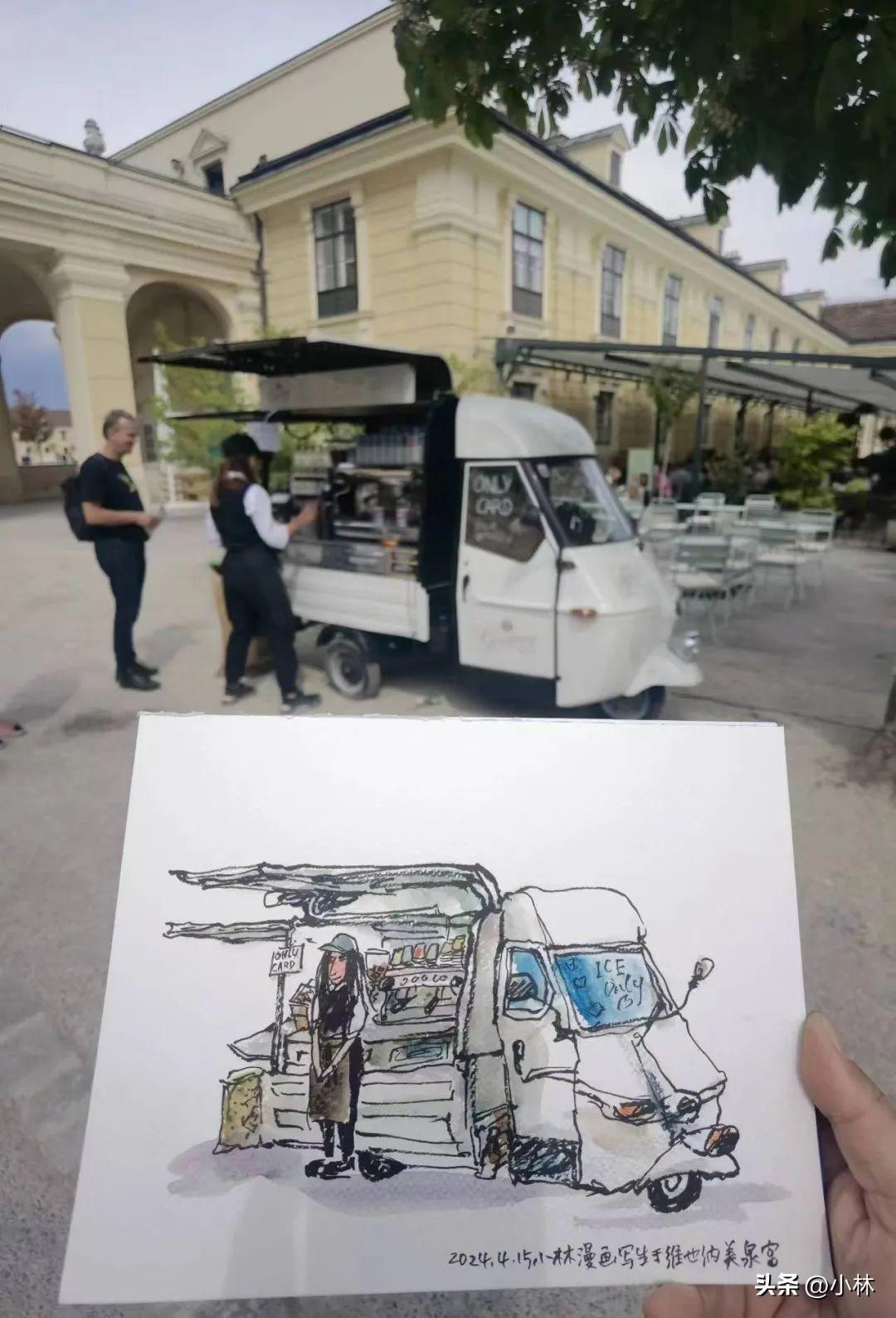 美泉宮花園裏的咖啡車,因爲沒有座位,所以也是站着畫的。