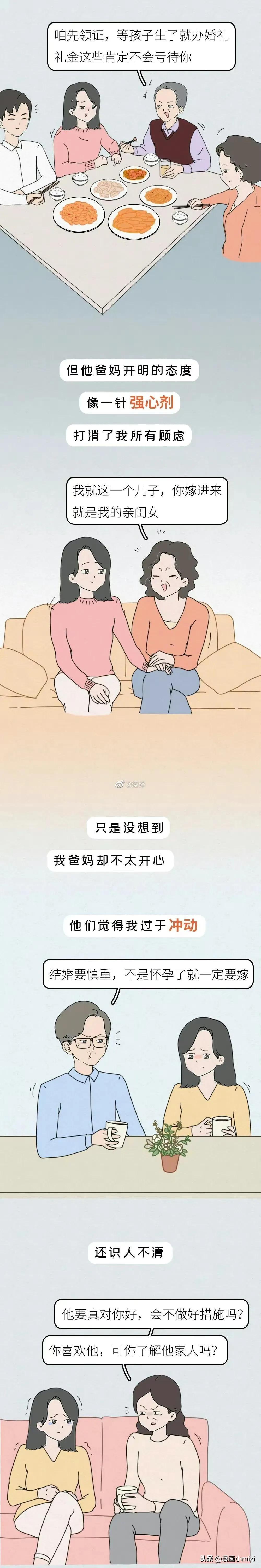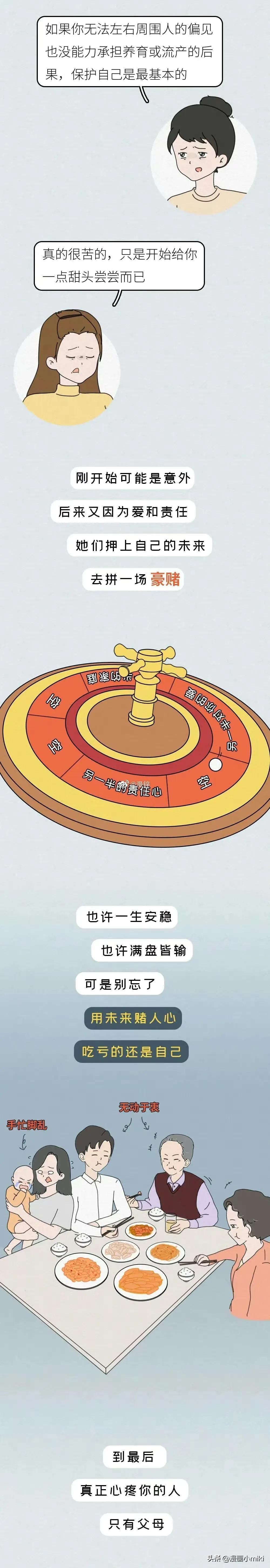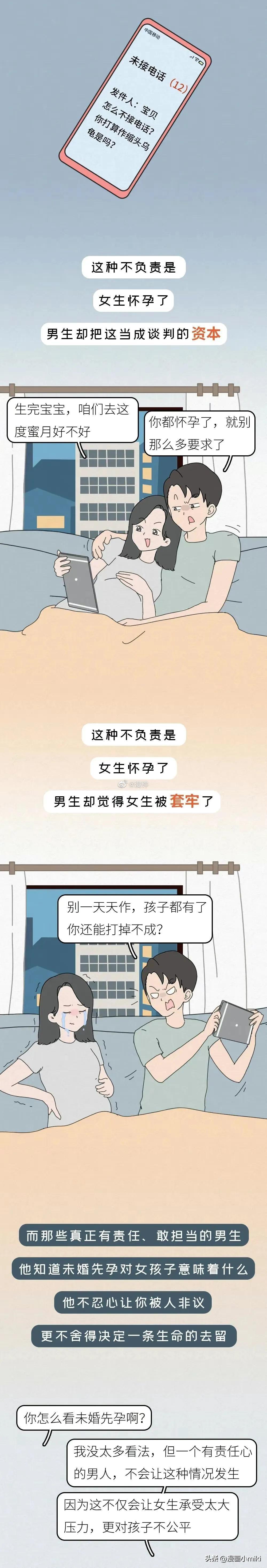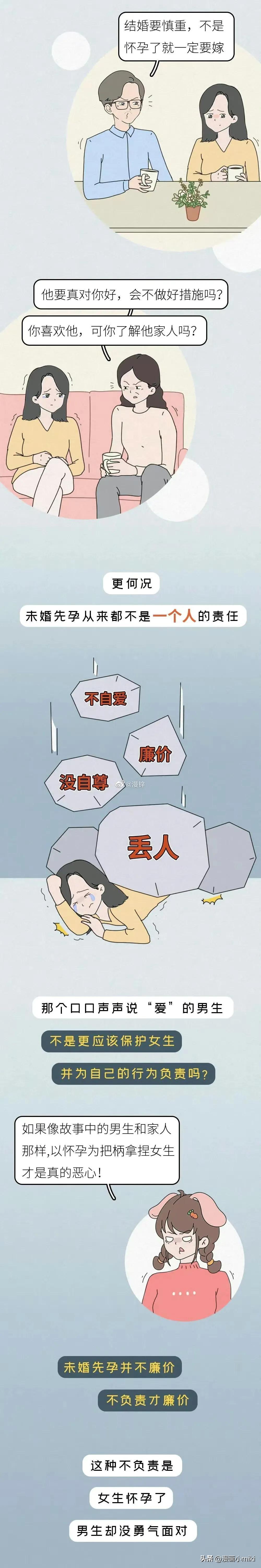 @曾曾曾珠奶茶女士: 我覺得未婚先孕首先是女生對自己不負責,如果運氣好碰上了負責的男孩子那當然是皆大歡喜,要是遇上了同樣不負責的男生就只能自食苦果了。承受後果這方面的確是女生虧,所以姑娘們要擦亮眼睛,拒絕危險的X生活。