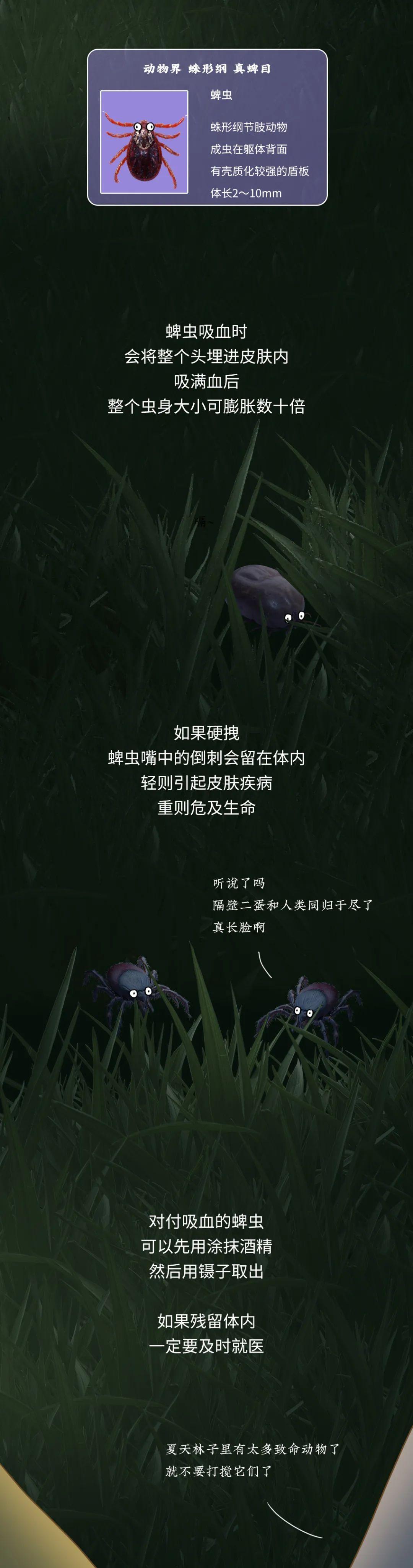 每年端午之後,便會進入蜱蟲、毒隱翅蟲等蟲子活躍的季節,在我們享受戶外時光的美好之時,也切勿忘了防備其中的危險: