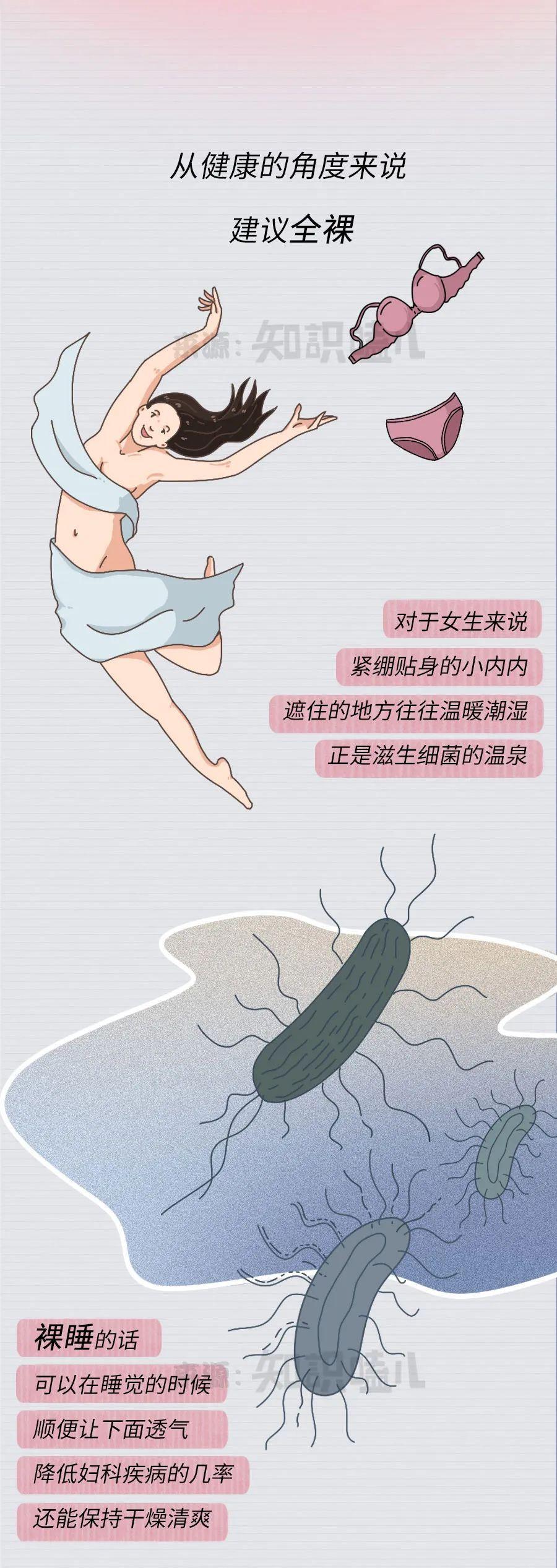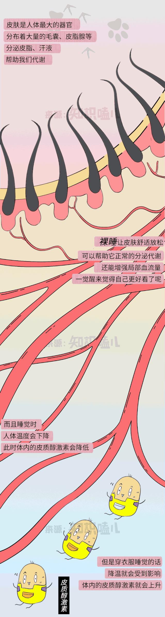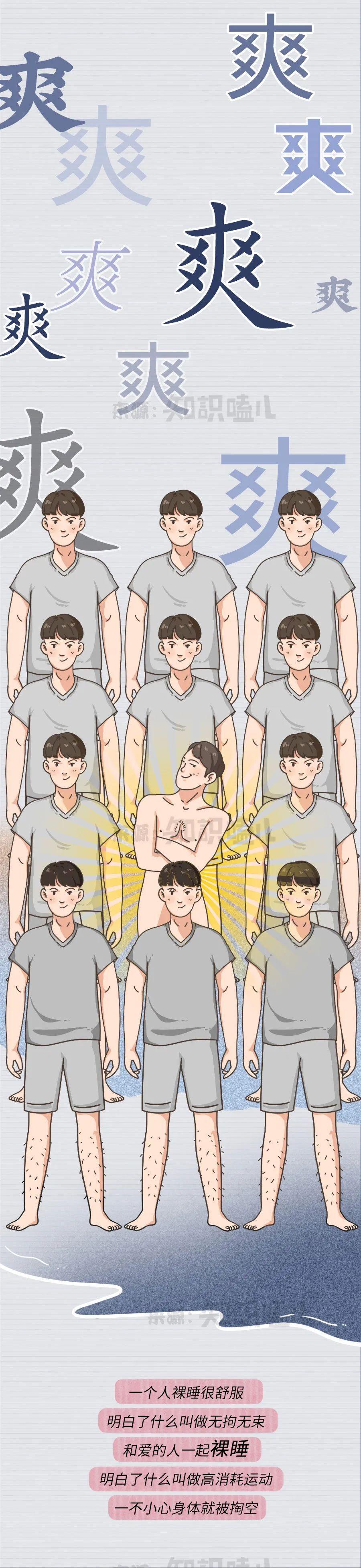 至於男生和女生,誰更適合裸睡?當然是兩個人一起裸啊,哈哈哈。從健康上來說,裸睡脫離衣服的束縛,促進睡眠質量,在一定程度上能夠緩解精神壓力,改善睡眠狀態。另一方面,皮膚與空氣的接觸,有利於促進血液循環和皮脂腺、汗腺的分泌,對頭痛、腹瀉等有一定幫助。據說還能變瘦變美,然而並沒有嘗試的機會......但是裸睡時也要注意:被子和牀單要勤洗勤換,保持乾淨和舒爽,經常清洗並接受陽光的暴曬殺菌;裸睡時要注意保暖,千萬不要着涼,可適當調節臥室的溫度和溼度,如果有泌尿系統疾病,最好不要裸睡喔~當然如果是兩個人一起,還要適當節制,不要彎道超車,以免過度勞累,嗯,全叔是個好孩子,我也不造自己在說啥~