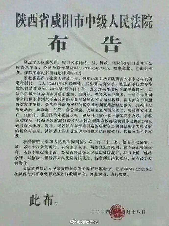陝西咸陽市中級人民法院近日公佈一宗曾轟動社會的殺人案調查報告,2022年時,男藝人張藝洋因不滿16歲女友提出分手,持刀將其殺害,並試圖製造女方自殺假象,最終以故意殺人罪被判處死刑,並已於去年12月18日被執行死刑,他也因此成爲中國娛樂圈首位被依法判處並執行死刑的藝人。