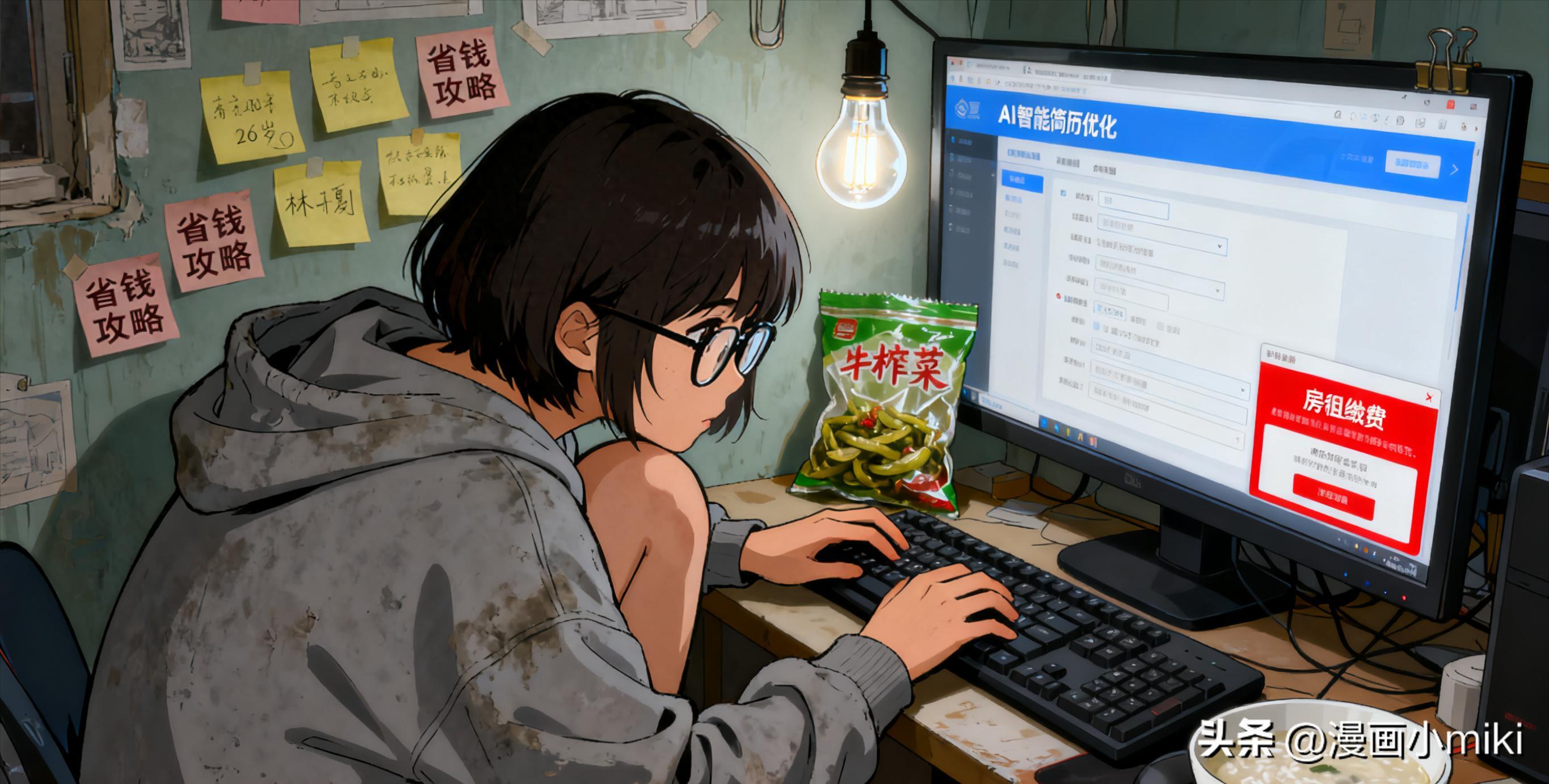 電腦屏幕還亮着,AI 工具仍在閃爍 “可提升匹配度 37%”。林夏突然關掉界面,點開外賣軟件翻了翻,又默默退出 —— 最便宜的青菜面也要 15 塊,夠買三天的米了。她端起泡好的榨菜粥,熱氣模糊了眼鏡片,卻清晰地映出牆上貼滿的便利貼:“電費充 100 送 5 元”“菜市場下午 5 點後蔬菜半價”“面試路線規劃(步行 + 公交)”。