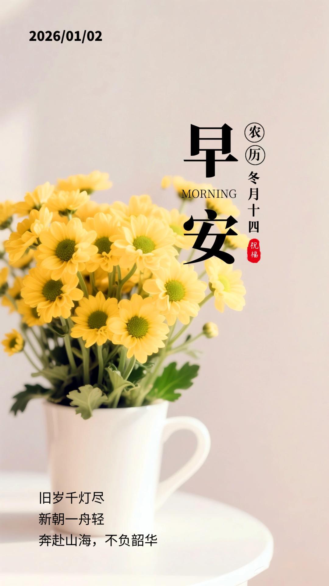 舊年霜雪化春水,新年花開滿路途。願你我晨起有陽光,夜眠有美夢