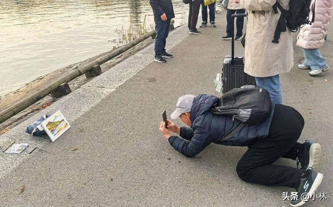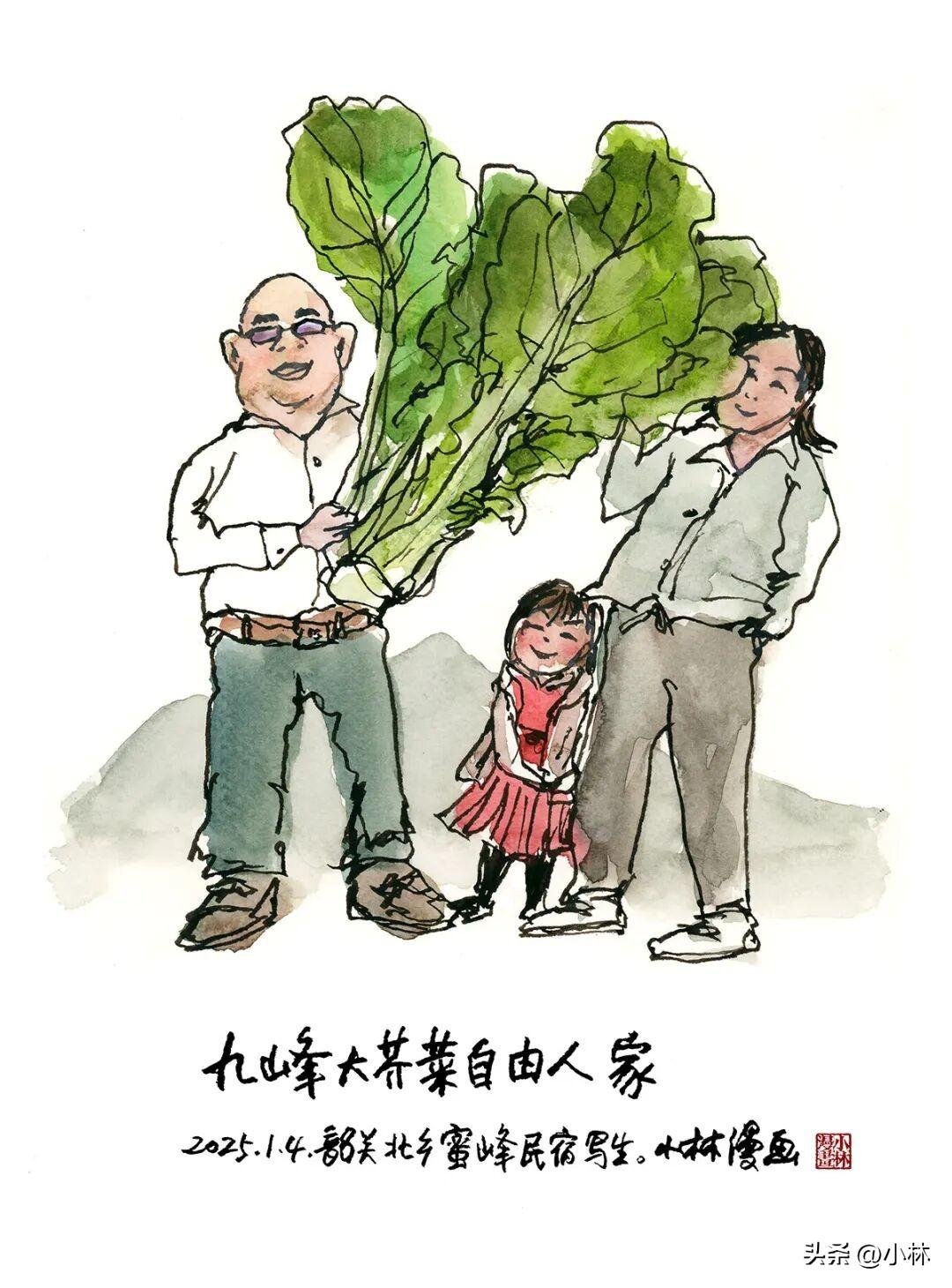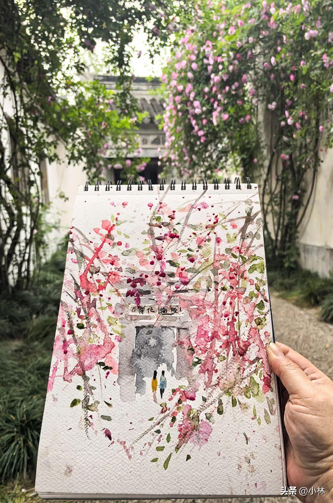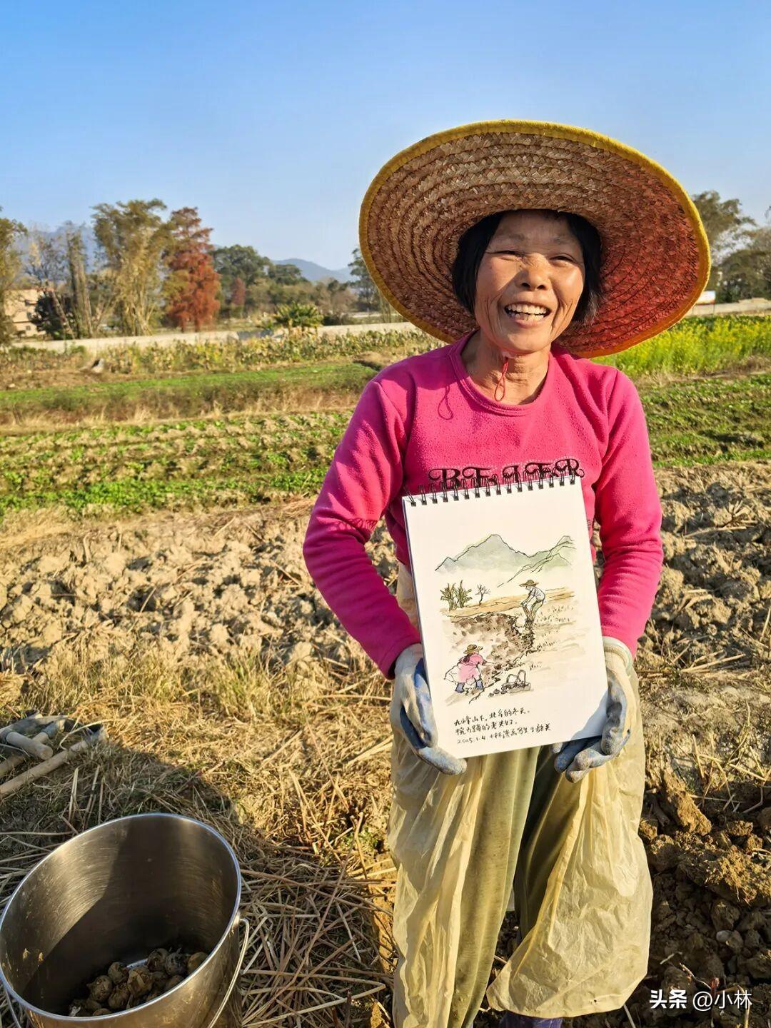 田邊寫生,挖馬蹄的阿姨看到畫裏的自己,笑得很開心。