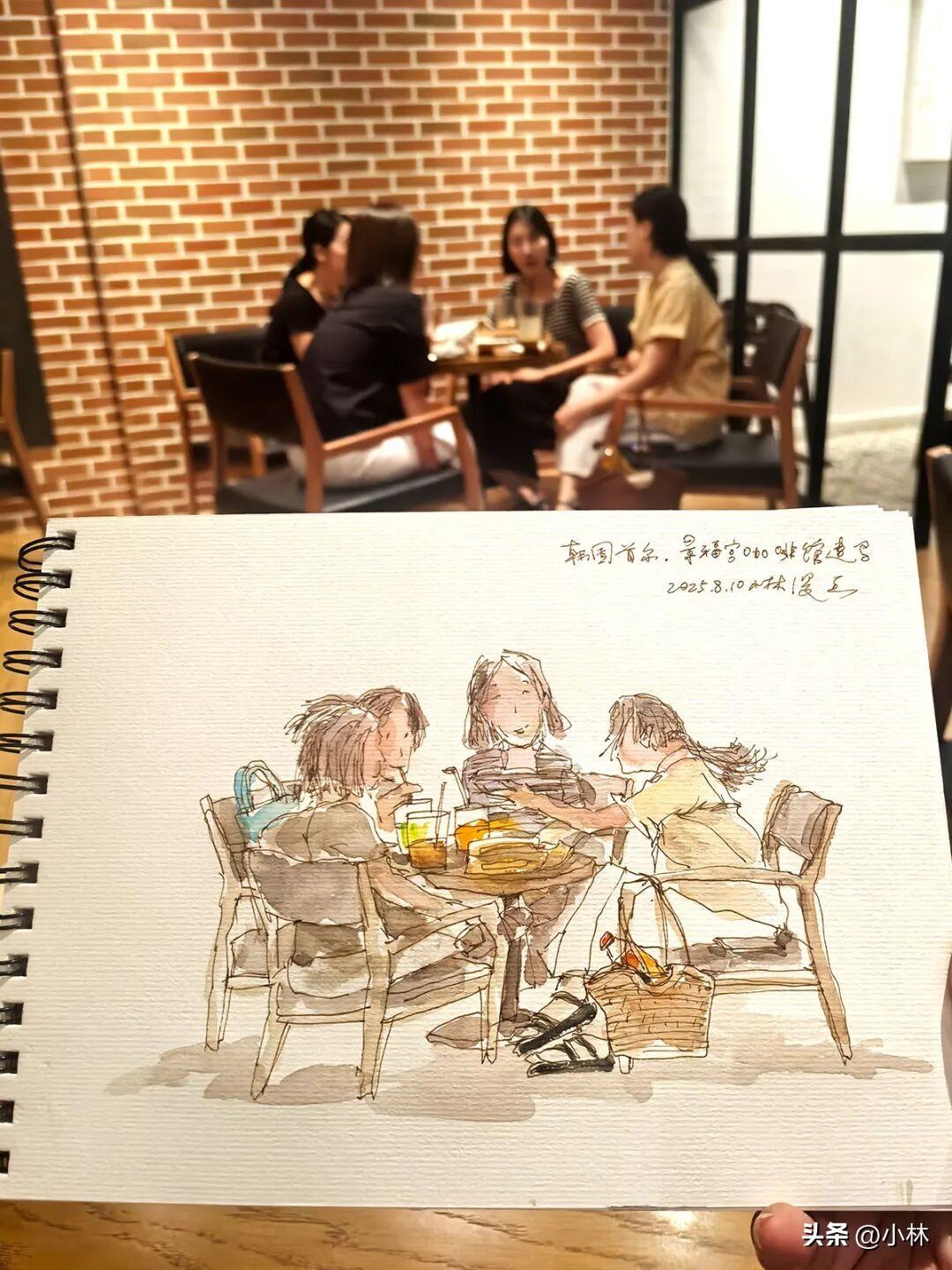 八月首爾,畫景福宮咖啡館裏聚會的人。