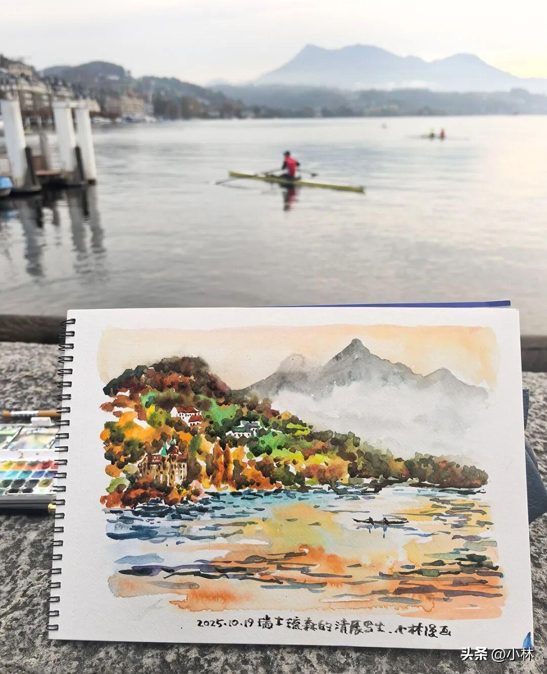 我在清晨的琉森湖邊畫寫生,吸引了來自全球各地遊客的注意力,很多人想買,但鑑於法蘭克福已經賺到錢,這畫我還是自己留着。