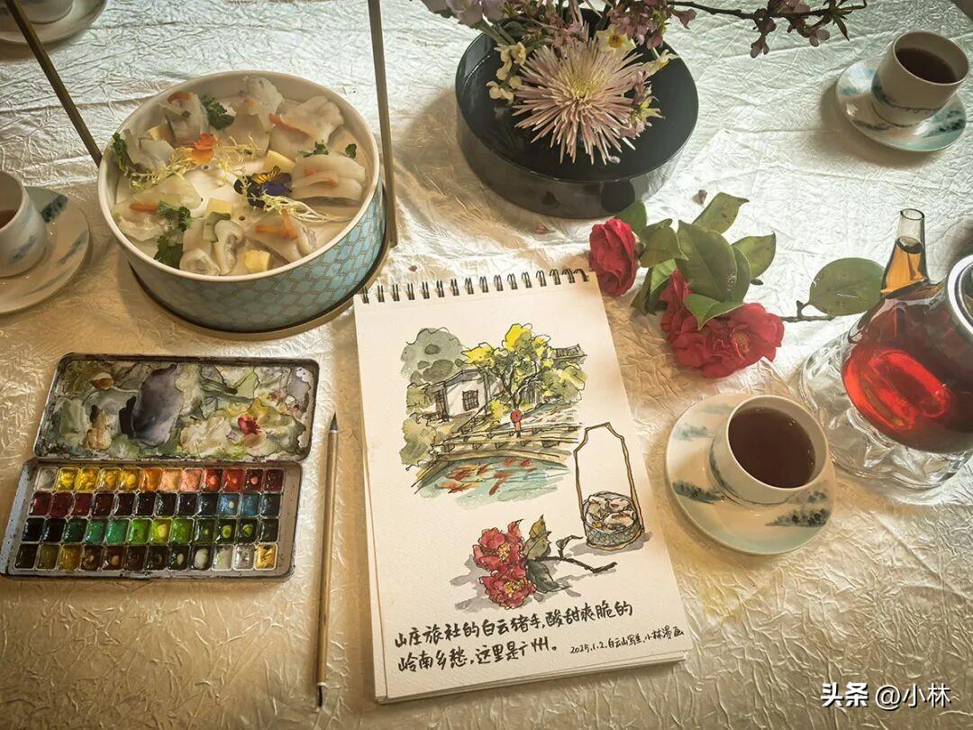 一月元旦,廣州白雲山,山莊旅社的茶花又開了,這裏的白雲豬手很好喫,點了兩盤,一盤畫寫生,一盤邊畫邊喫。