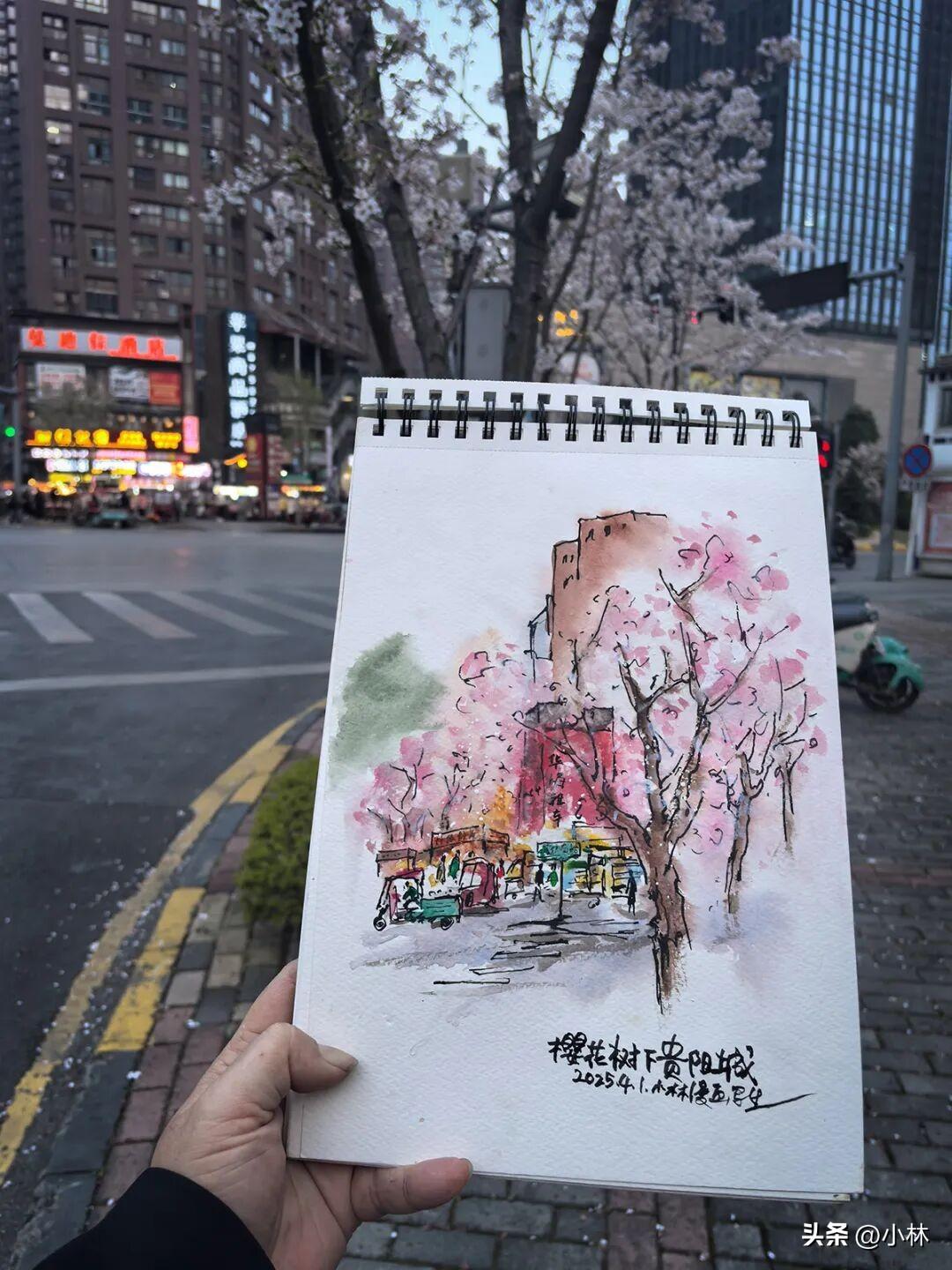 四月愚人節,貴陽街頭的櫻花又開了,畫下黃昏時櫻花樹下的街頭夜市。