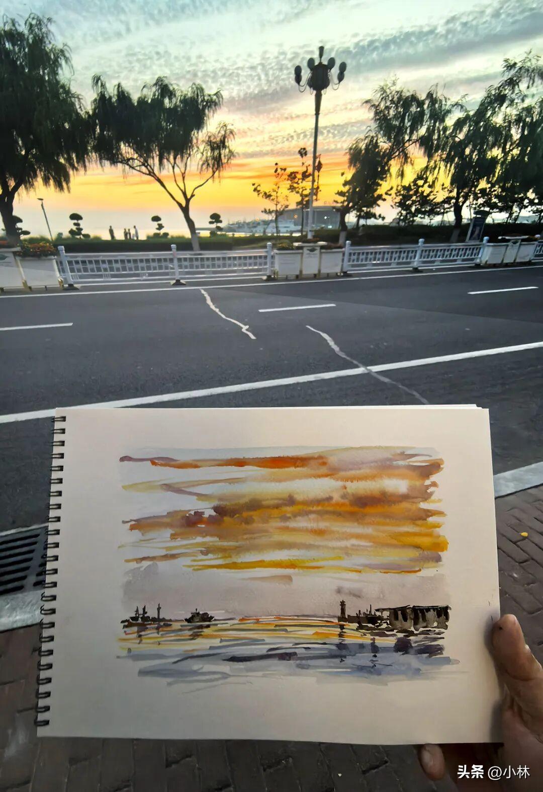 八月,山東長島的碼頭邊,喫撐了海鮮,畫張碼頭晚霞消化一下。