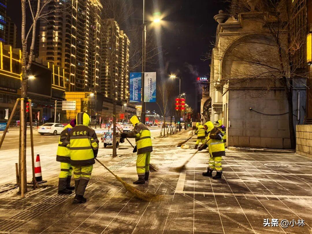 二月,黑龍江哈爾濱,每天飄雪,因爲有國家重大活動,環衛工人連夜掃雪。