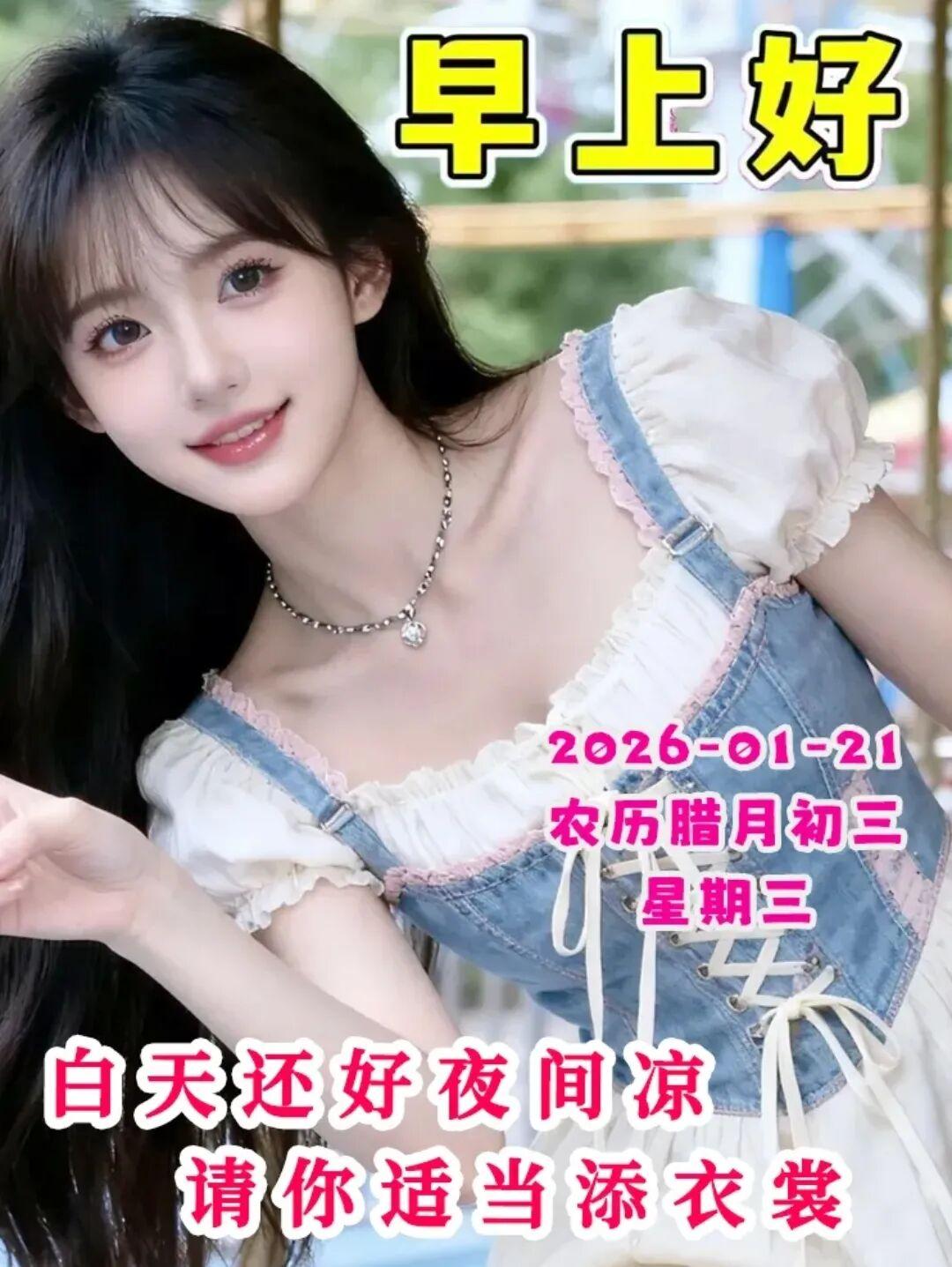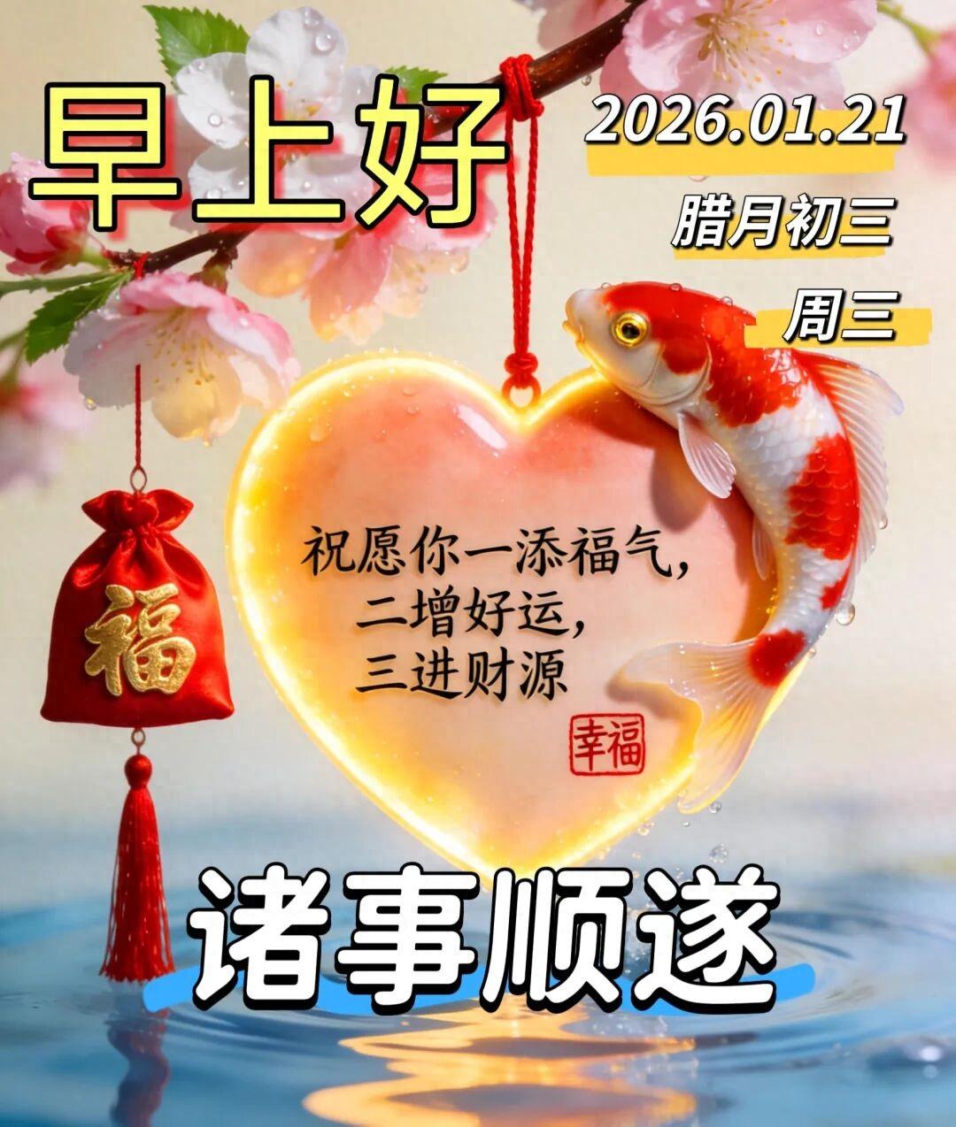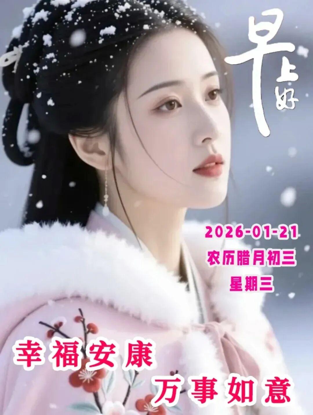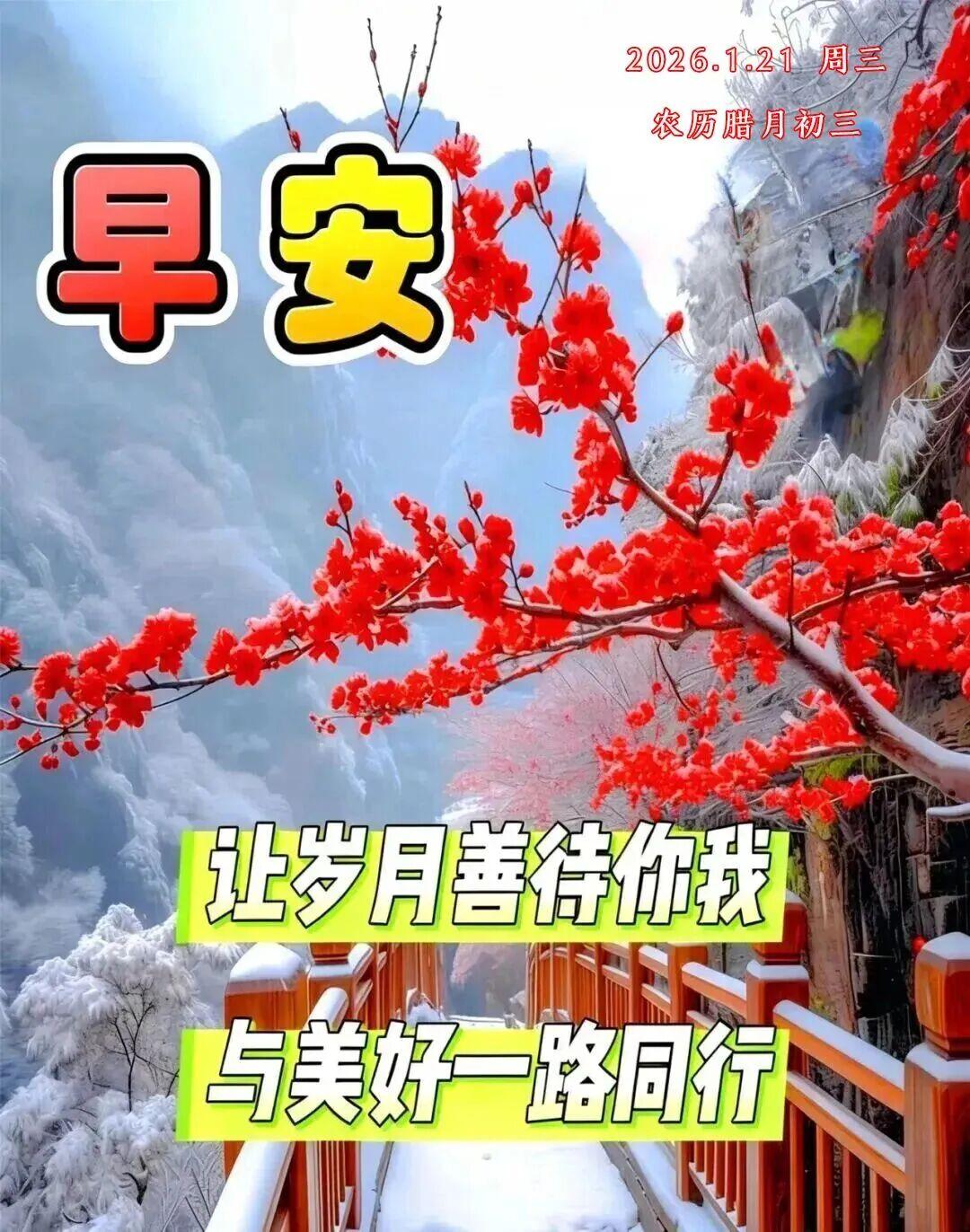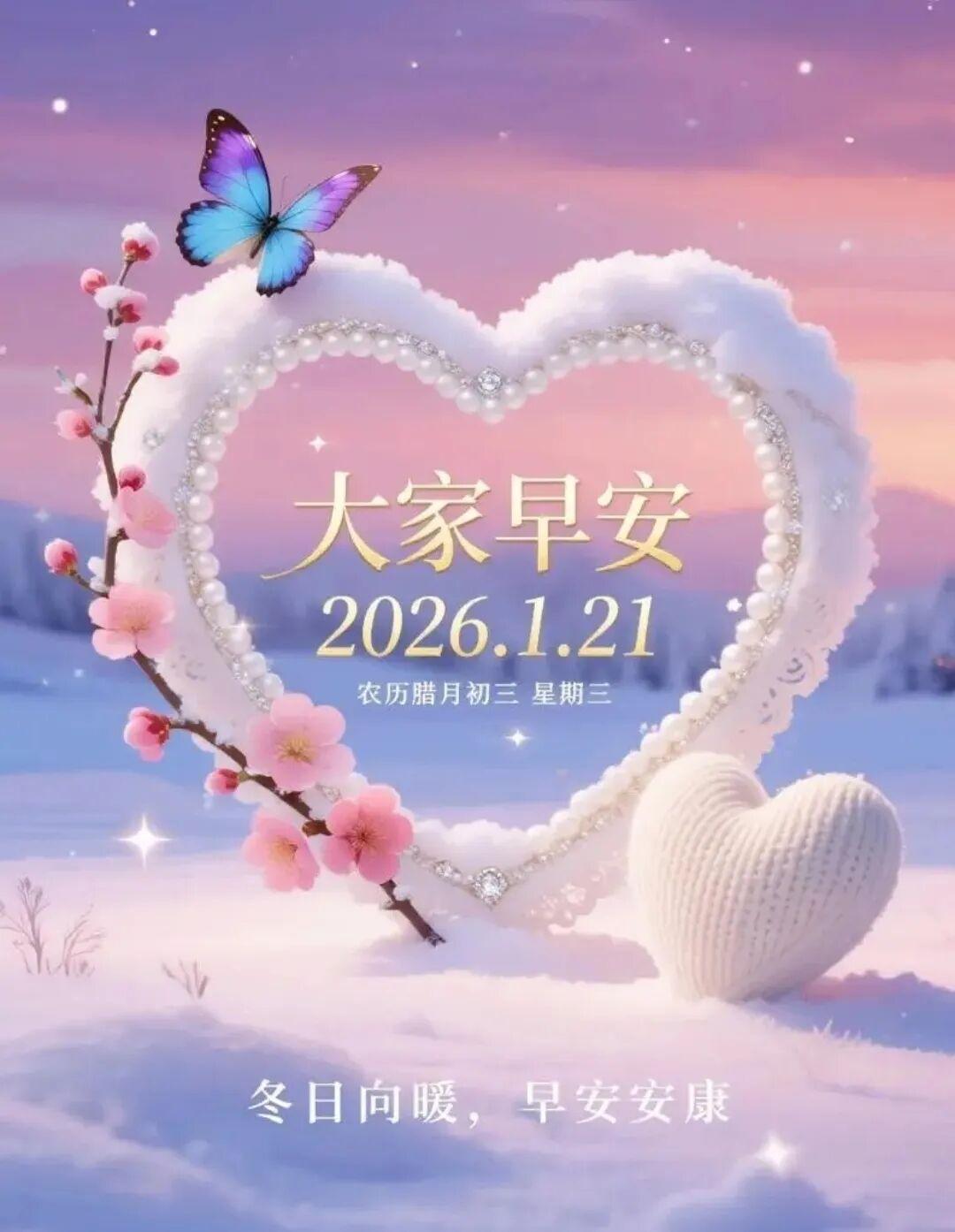 今天是2026年1月21日,星期三,早上好呀~ 冬日雖寒,心卻向暖,願你眼裏有光,心中有愛,腳下有路,前方有夢,把日子過成詩,把生活釀成蜜,諸事順遂,萬事如意。