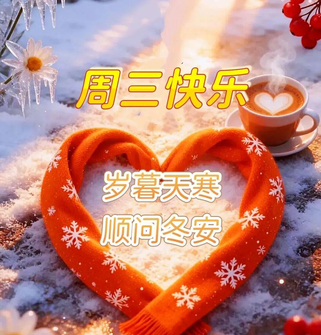 週三到❄️,牽掛到,天氣愈漸寒冷,思念愈發深切,遠方的朋友你可安好?天寒記得添衣保暖,降溫注意防寒御凍☃️!冬日的暖陽是我對你的問候☀️,飄飛的雪花是我對你的祝福❄️。傲雪的臘梅,爲我送去沁人的芳香,週三到了,願你健健康康!