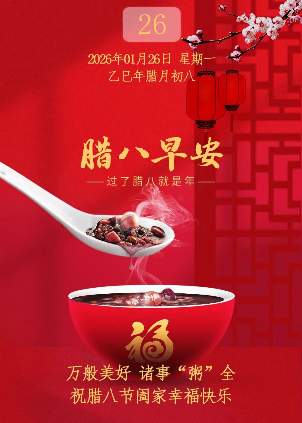 今天是1月26日,星期一,早上好呀~ 今天是臘八節~過了臘八就是年,粥香裹着年味漫,掃塵備福貼春聯,盼得家人早團圓,歲歲安康常相伴,日子紅火比蜜甜。