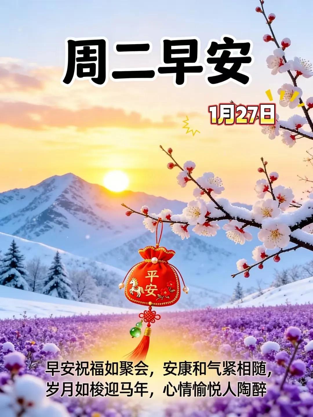 今天是2026年1月27日,星期二,清晨如約而至,問候準時傳遞。希望你的一天充滿溫暖帶上笑容和快樂,去迎接每一個美好的瞬間。願快樂,貫穿年初年末!讓幸福,陪伴年頭年尾!讓好運,伴隨晨曦日落!讓健康,守護春夏秋冬!早上好!