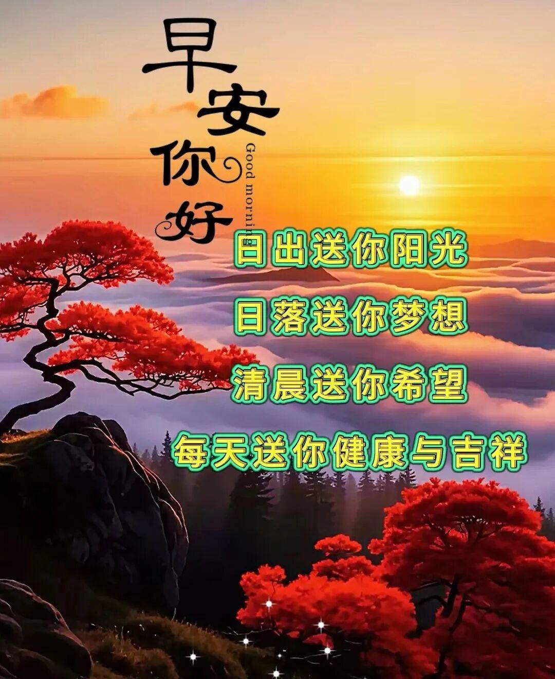 10、早安!昨天的一切已成爲過去,今天的生活正式開啓!迎接嶄新的一天,在這美好的時刻,送上溫馨的祝福,寄去暖心的問候,願大家在新的一天:順順利利,喜樂無憂;平平安安,健康相伴!早安!