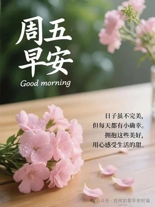 好心情,源於好心態;好生活,從清晨來。心中有光,歲月芬芳;心中有愛,風雨無礙。朝陽初升,暖意盈盈,莫負晨光,步履輕盈,週五早安,喜樂常寧!