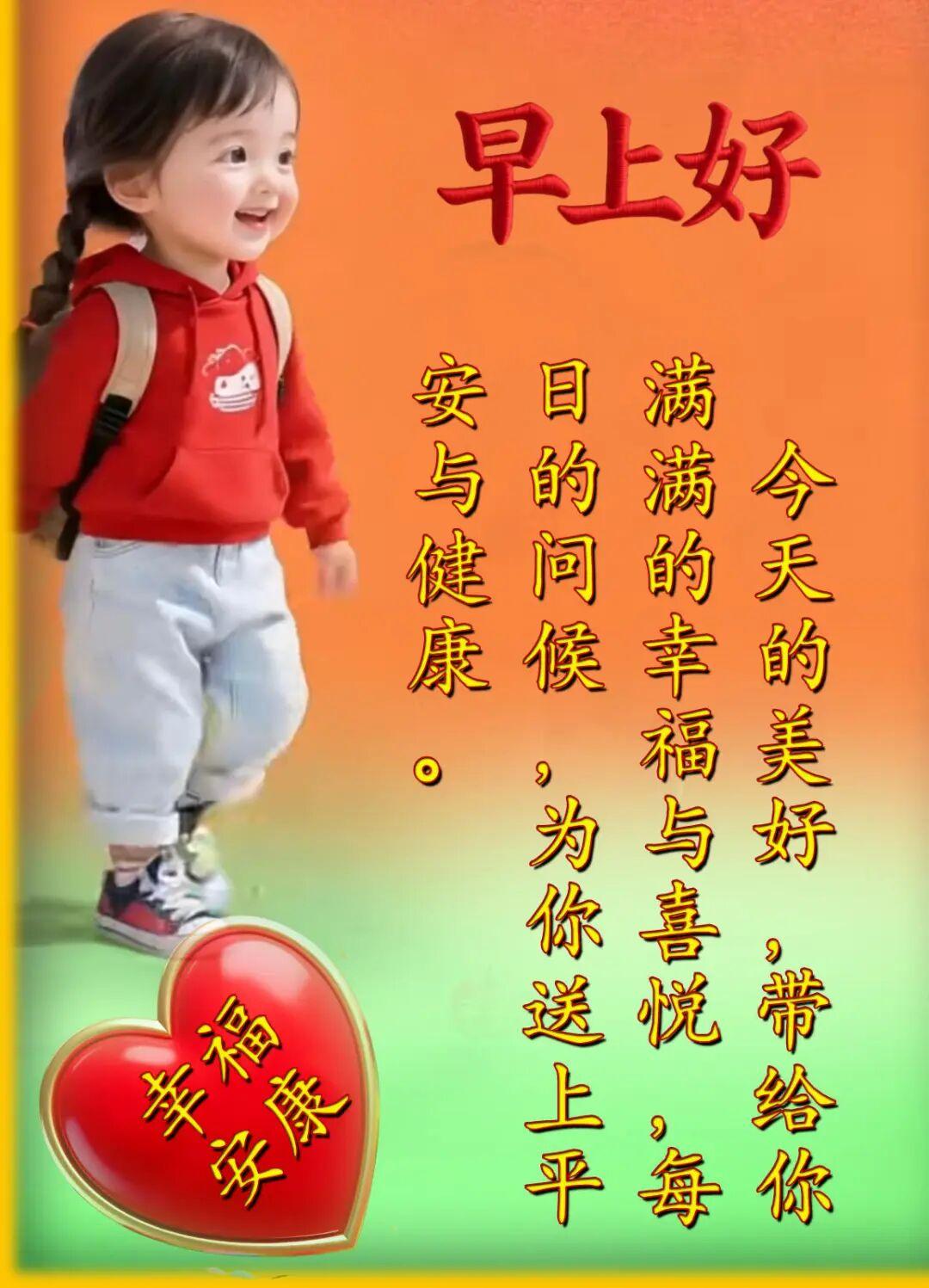 清晨到夜晚跑,道句早安心情好,早睡早起身體好棒,一天心情樂逍遙,上班順利生活好,煩惱憂愁到九霄,還有祝福身邊繞,朋友祝福籤個到,幸福常開開心好!❤️