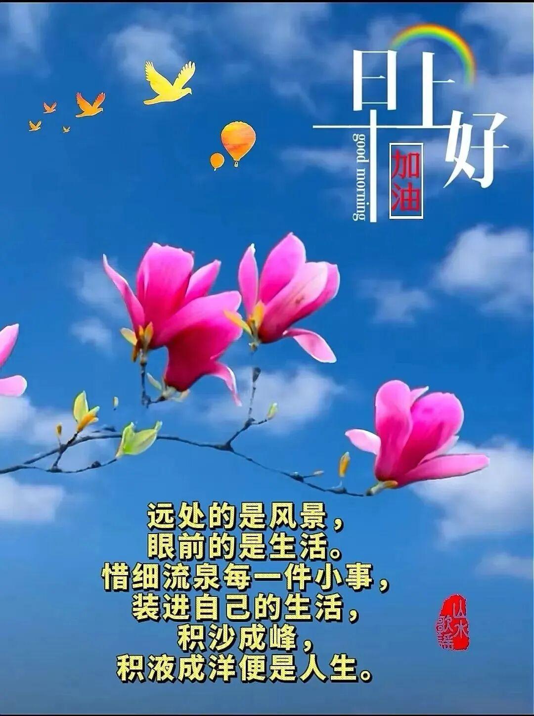 7、公雞勤起叫你事業“高高樓”,小狗早吠讓你工作“旺旺旺”,喜鵲報時喚你每天“嘻喳喳”,晨風呼喚鼓掌快樂“嘩啦啦”,送你祝福短信讓你健康“爽歪歪”,祝你清晨快樂的心情時刻“美滋滋”,美好時光從清晨開始,早安!
