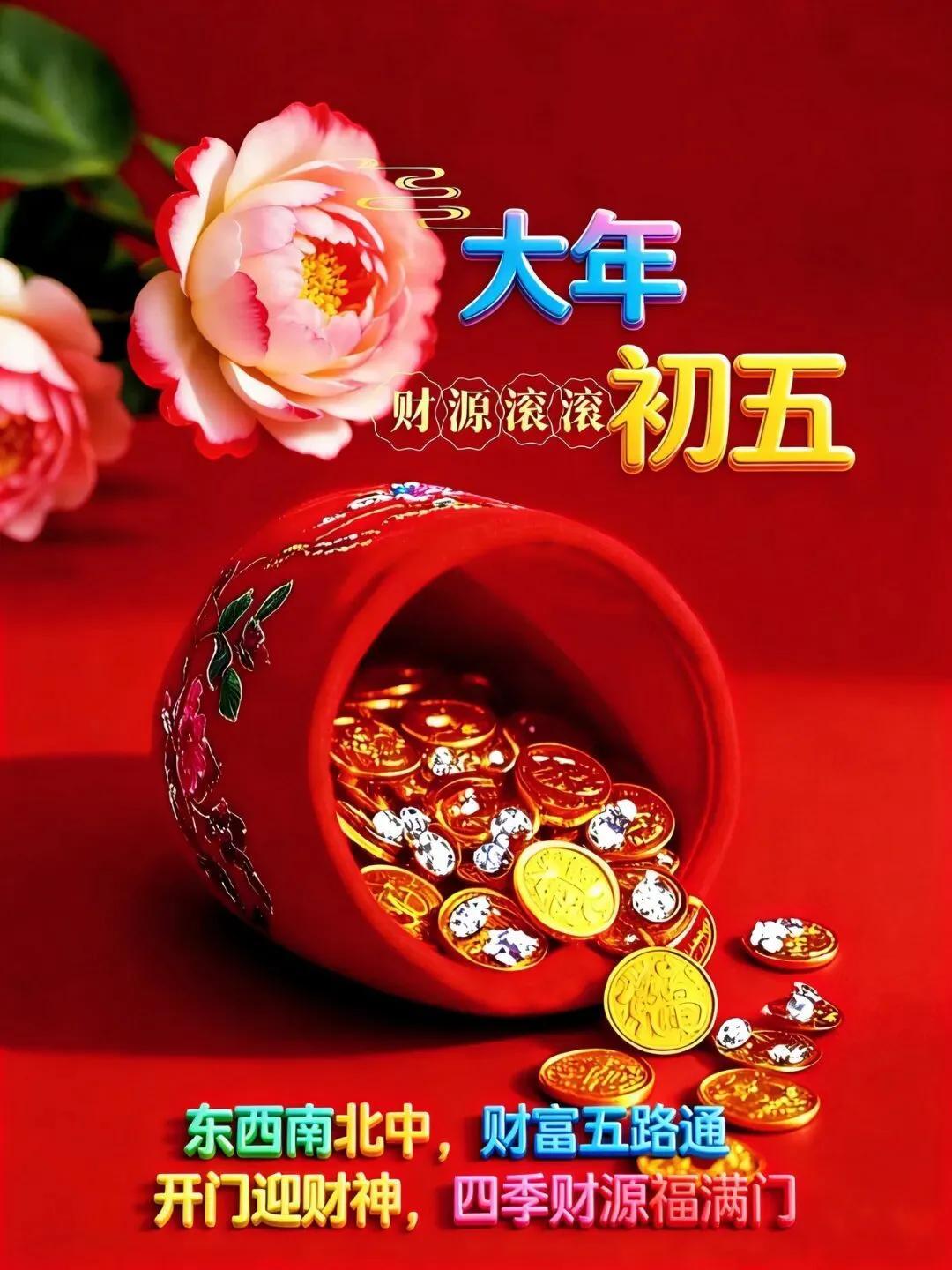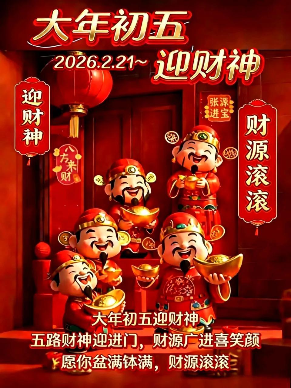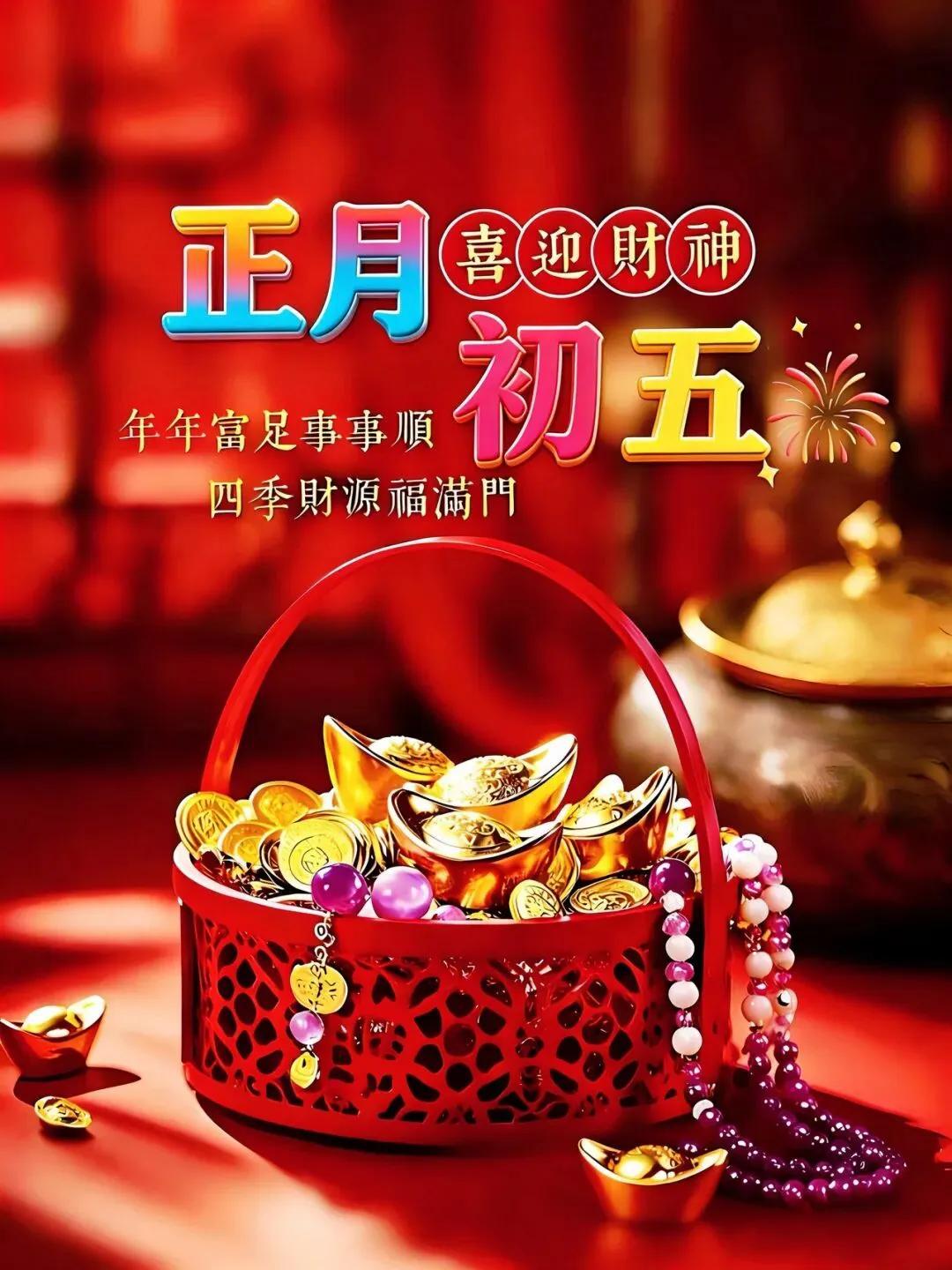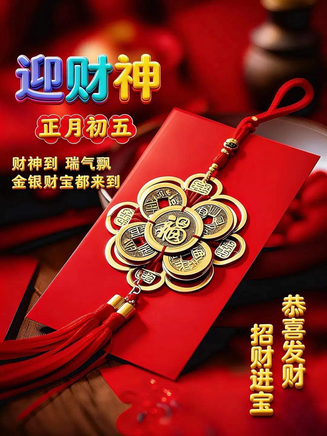 年初五祭財神,五路財神迎進門:東路財神送你福滿安康,西路財神送你財源滾滾,南路財神送你家和美滿,北路財神送你愛情美美,中路財神送你幸福平安。早安!