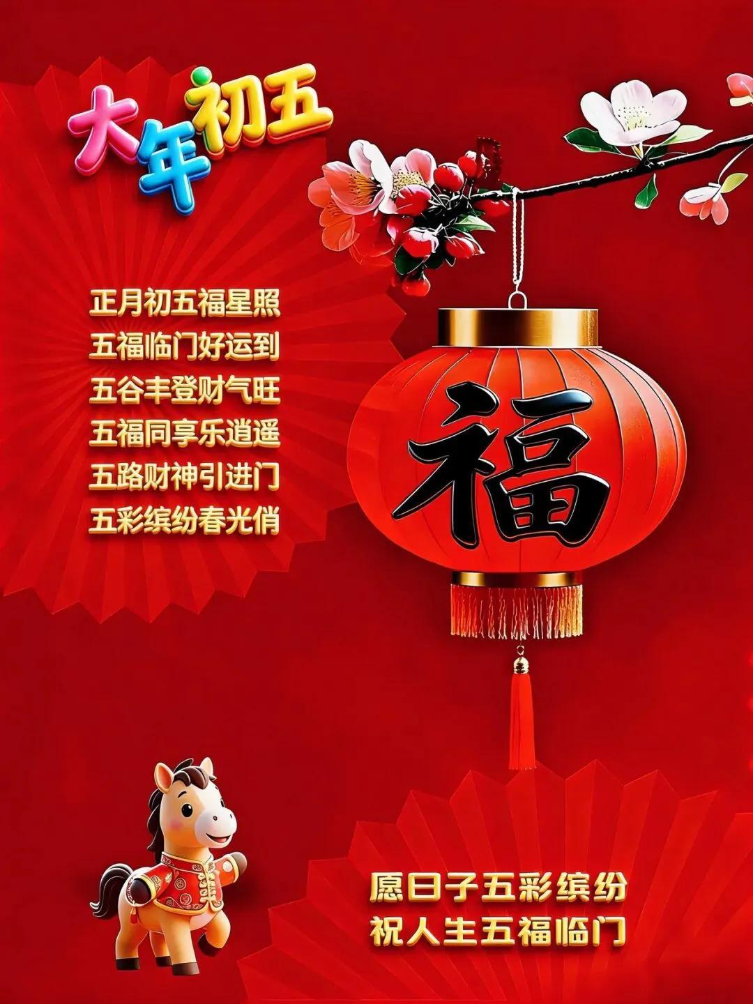 馬年初五喜洋洋,接得財神好運長。財富安康皆入囊,祝福聲聲暖心房。新歲願您福滿倉,好福相伴永不忘!