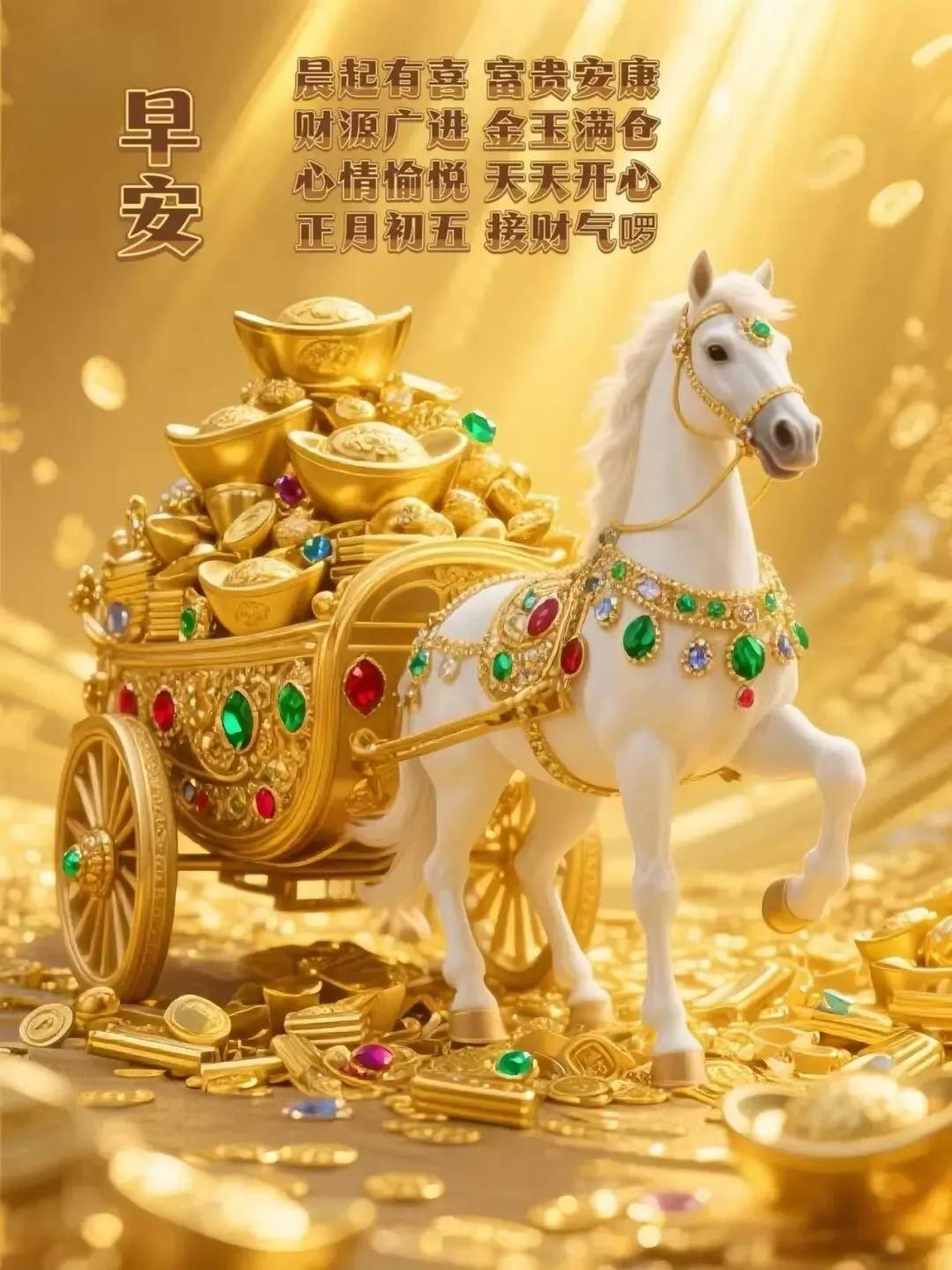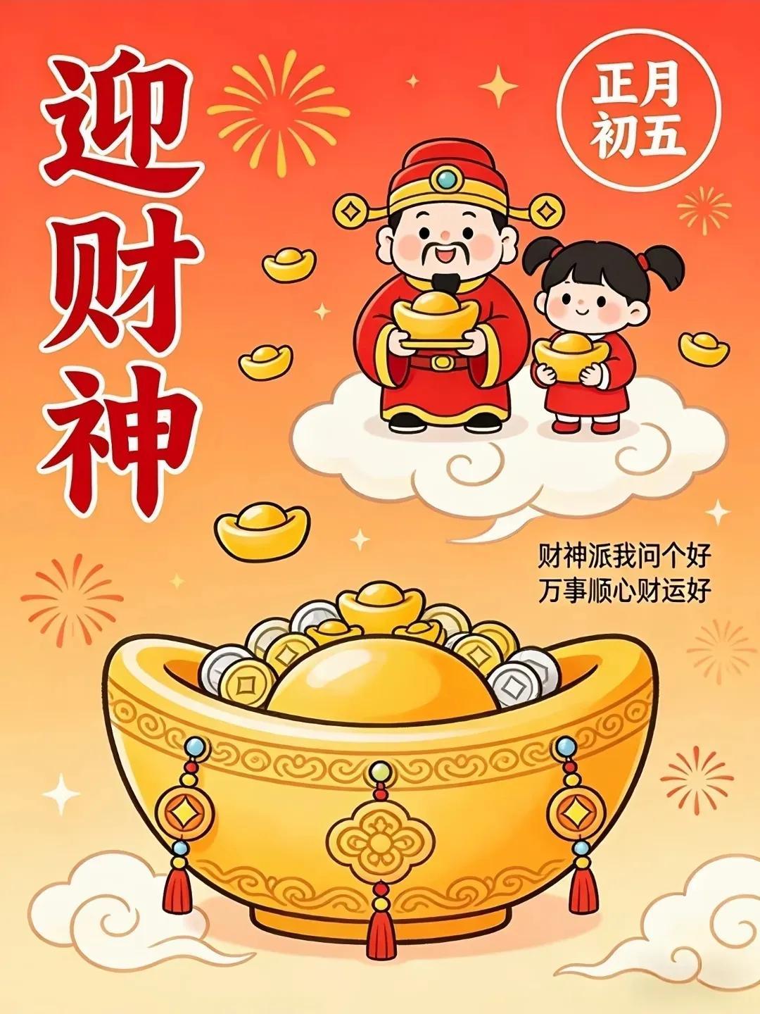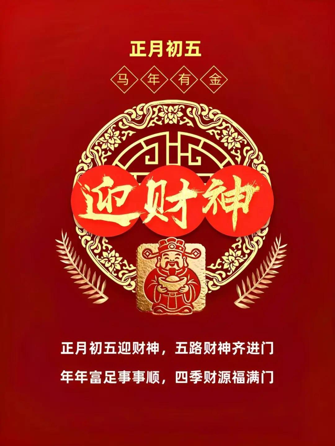 正月初五迎財神!五路財氣齊登門,護佑丙午馬年行。祝您事業如駿馬奔騰,八方來財,日進斗金。更願新歲五福臨門,金玉滿堂,守得財源滾滾,納得闔家幸福!