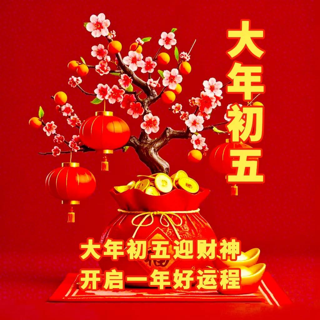 大年初五財神來,吉祥如意福滾滾。紅紅火火歡聚會,財源廣進樂無邊。福祿壽全家庭團,健康長壽笑開顏。❤️祝福朋友財運旺,福滿身心幸福圓。