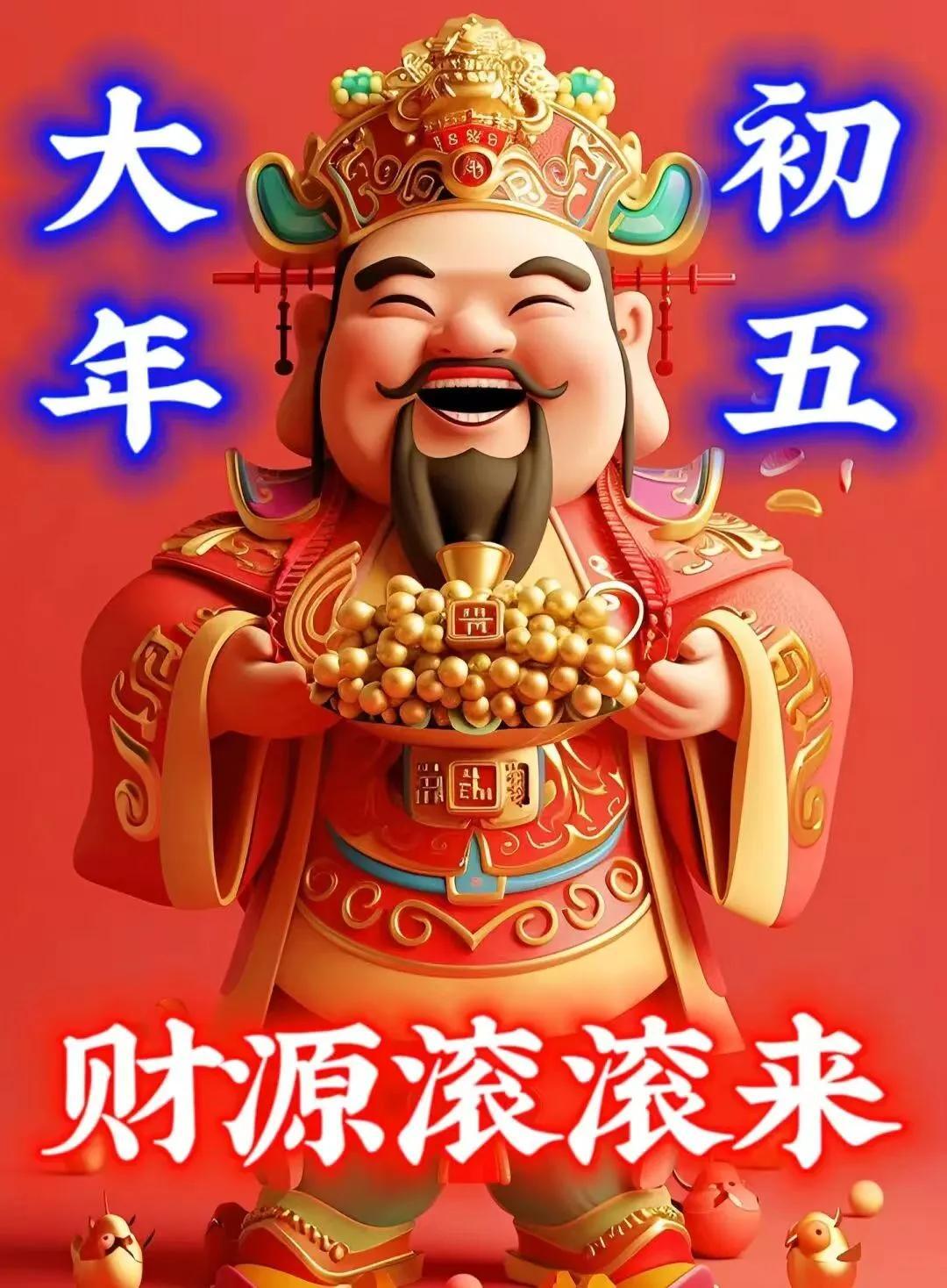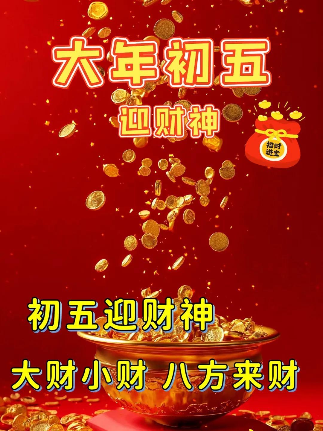 大年初五財神迎進門,大財小財,八方來財;養財蓄財,和氣生財;接財進財,財運亨通!祝錢途似錦好運來,大展宏圖財氣旺!