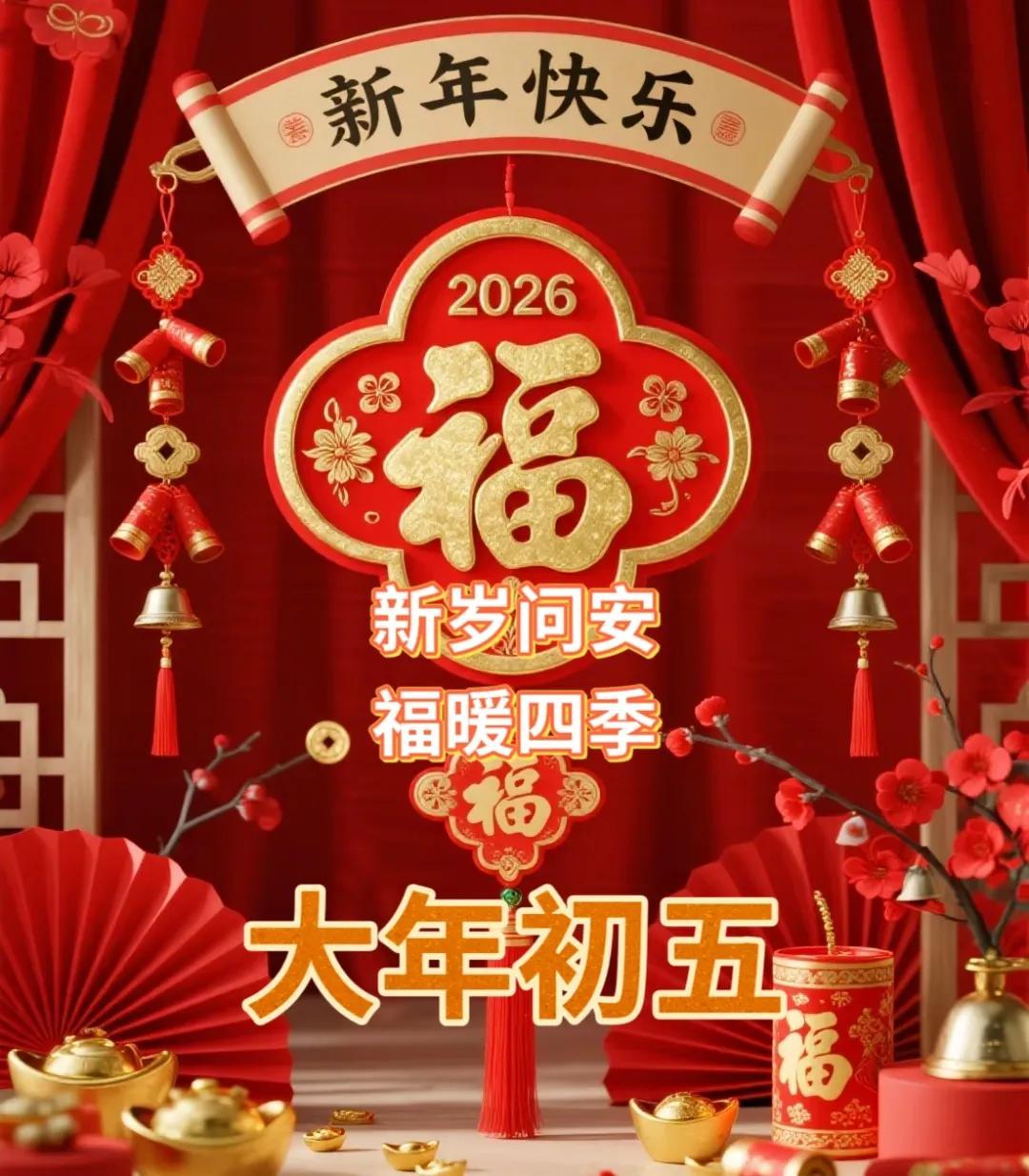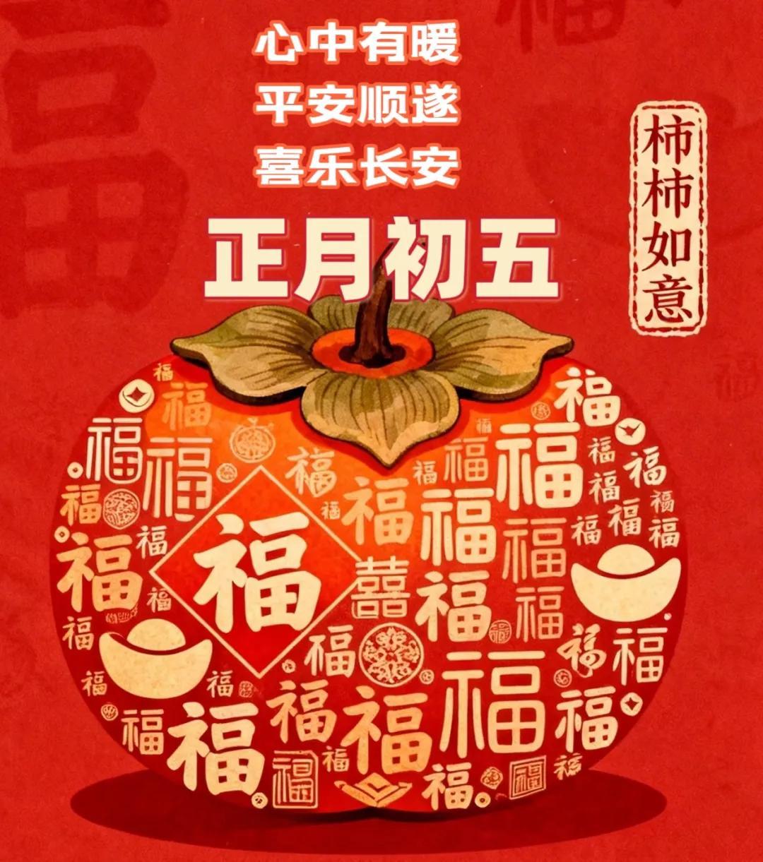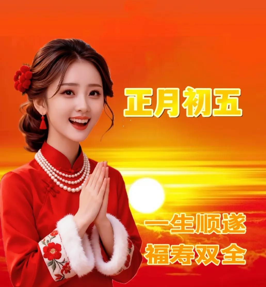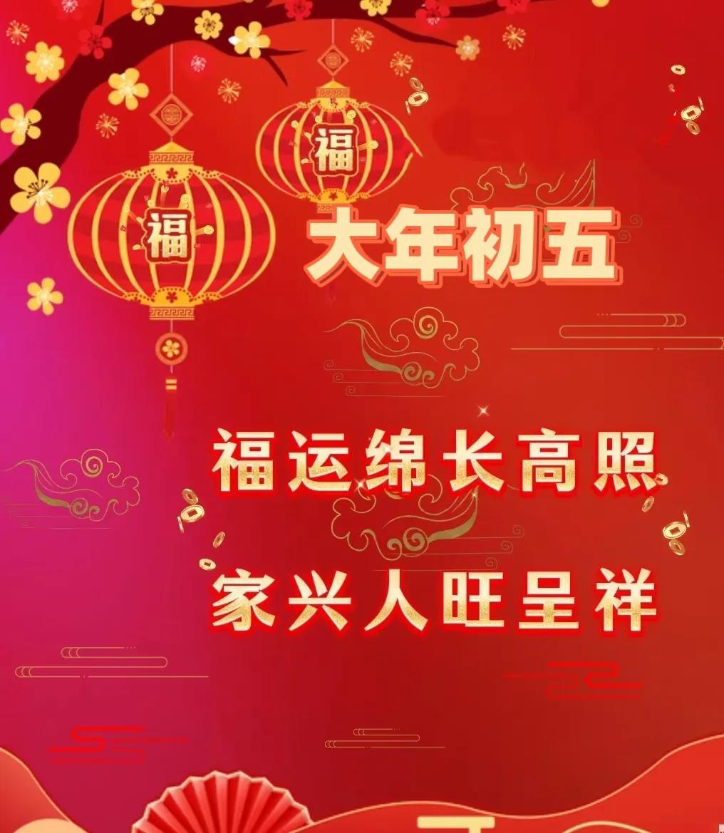 大年初五,財神到家門。願你在新的一年裏,財源廣進,金玉滿堂;事業有成,步步高昇;家庭和睦,幸福安康。祝你春節快樂,萬事如意!早上好!