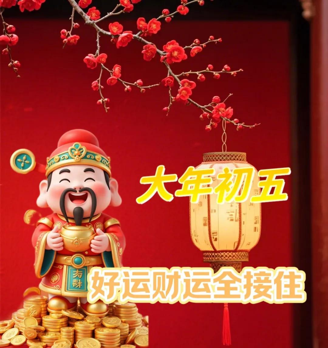 春節初五,五路財神來運財,東南西北中,財運聚你家。祝福你住在黃金屋,遍種搖錢樹,盛放幸福花,結滿富貴果,處處都是聚寶盤,條條大路通財路!早安愉快!