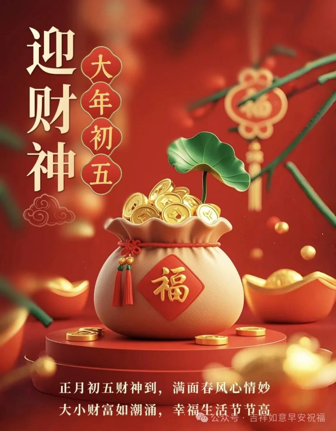 大年初五送祝福,如意吉祥樂滿屋,幸福安康財運足,福壽綿長好運殊,家人朋友同歡笑,團圓相聚喜難書,祝願新年初五日,快樂幸福踏坦途。早上好!
