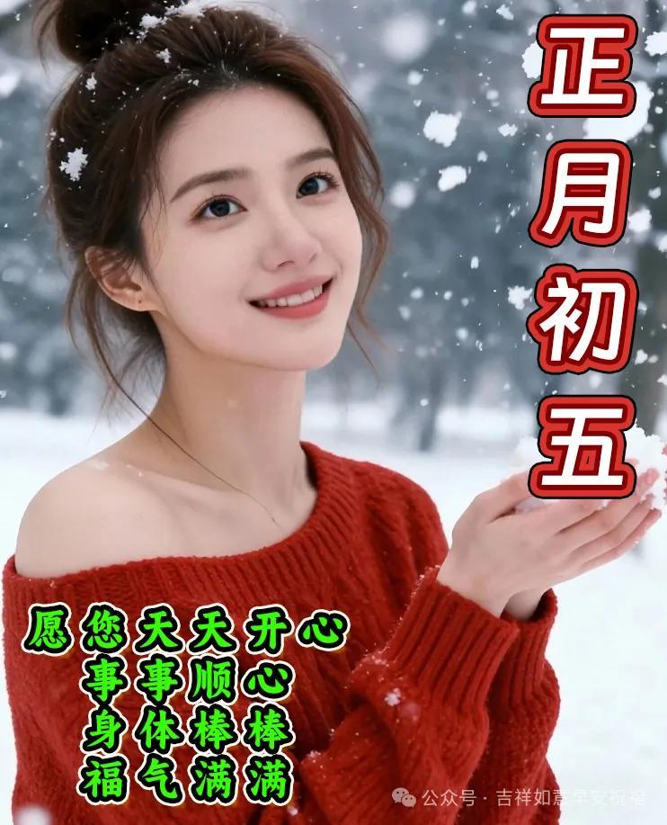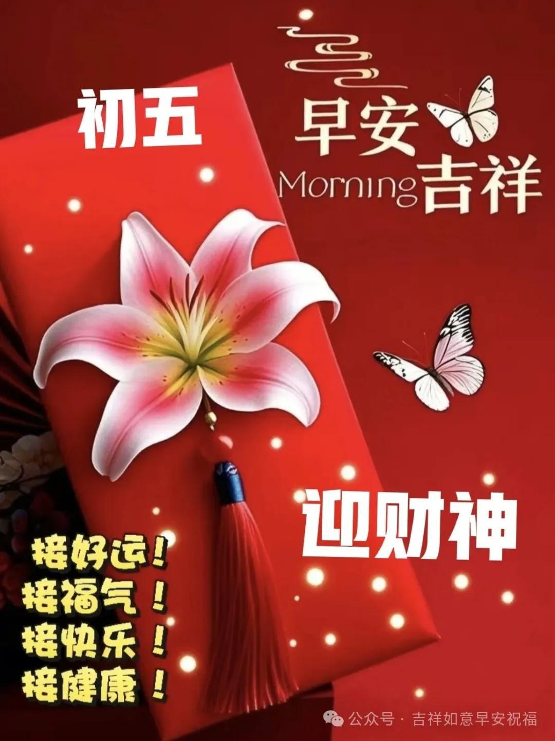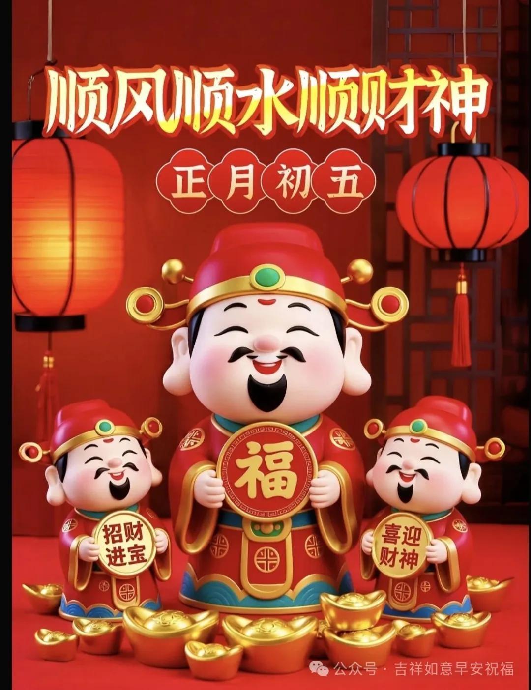 正月初五,驚喜無限;財星高照,福滿家園;祿星進門,加爵升官;壽星賀春,壽比南山;喜神報喜,好運無限;攜手衆仙,共迎財年;祝你新春,富貴美滿。早安!☀️