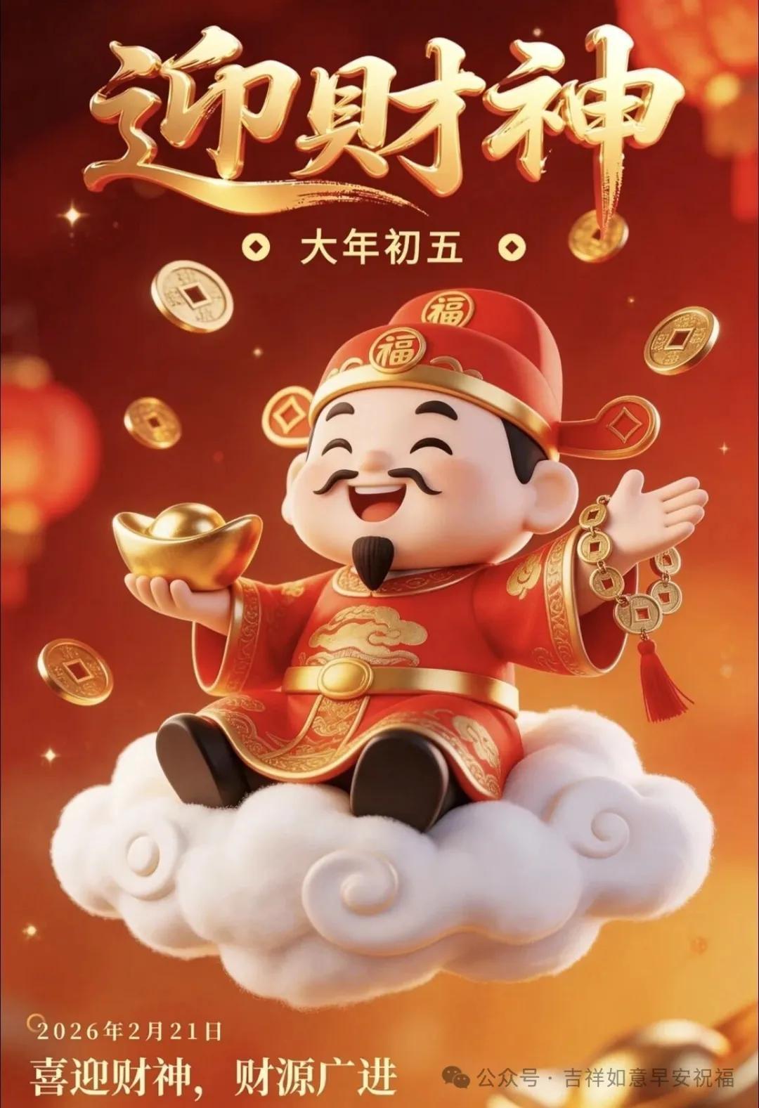 初五吉日,送窮神出門,接財神進門。祝您2026馬年:竈頭有煙火,日子熱氣騰騰;口袋有金銀,財源滾滾而來。事業節節高,萬事皆順心!大年初五,迎財王。