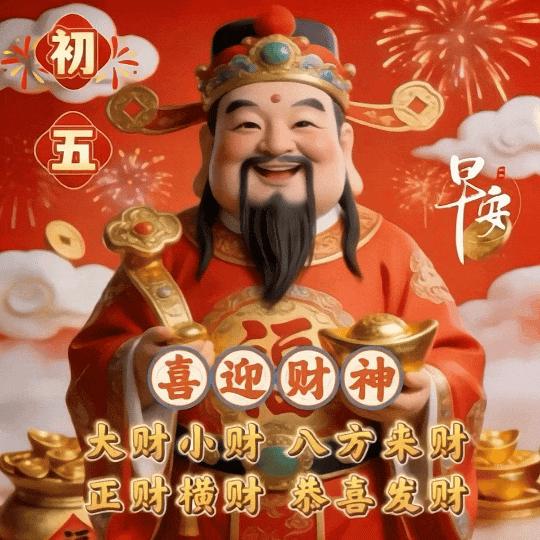 初五財神下凡間,賜你富貴與平安,左手金來右手銀,幸福生活比蜜甜,願你前程多爛漫,招財進寶笑開顏,祝你財路通達廣,如意吉祥滿福艙。早安你好!