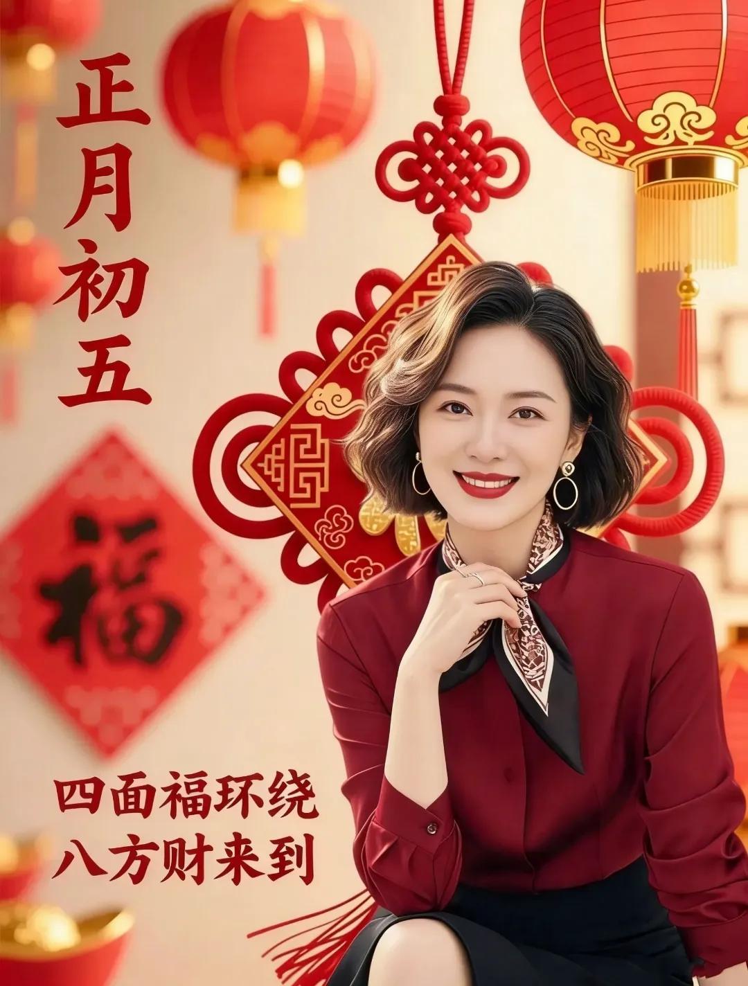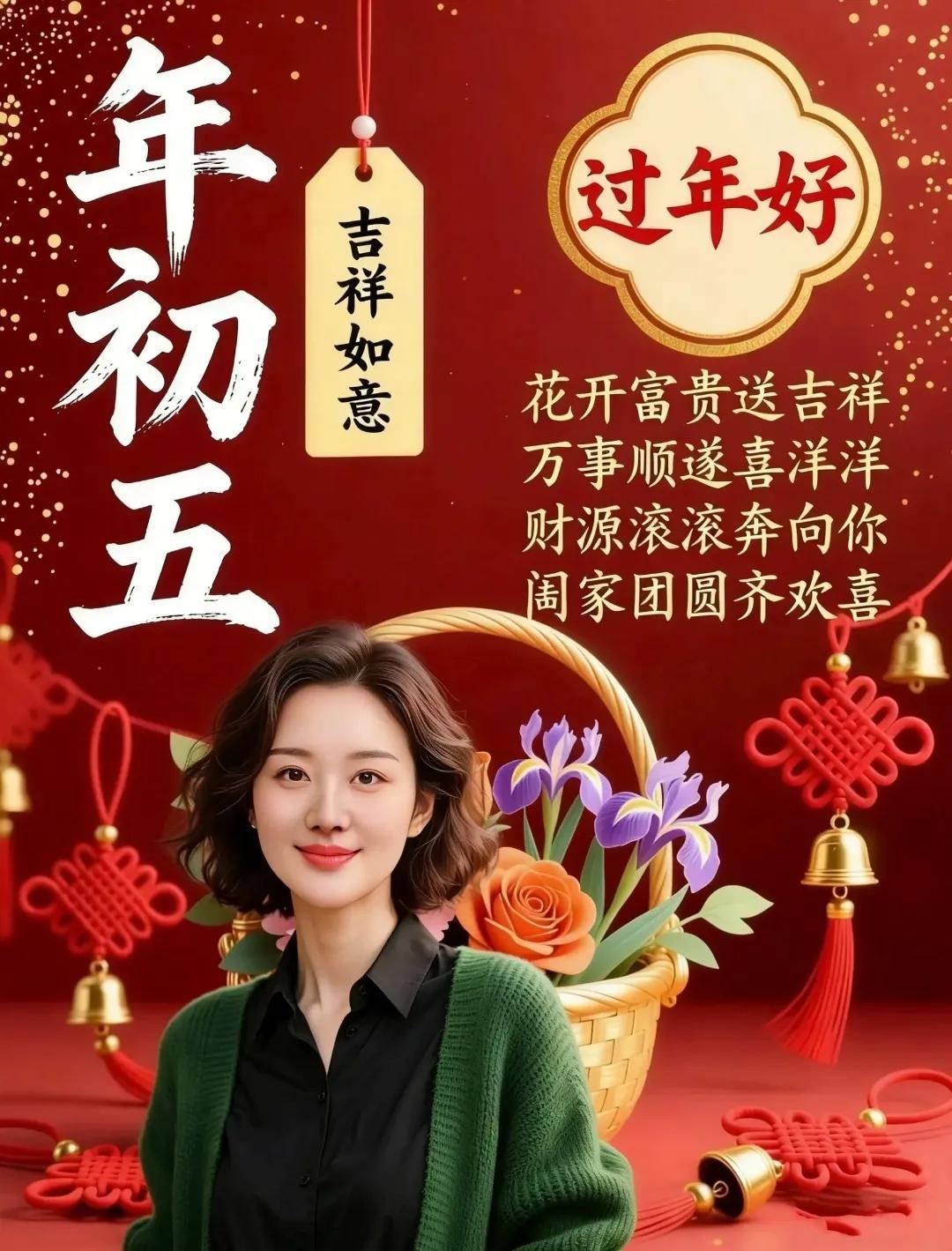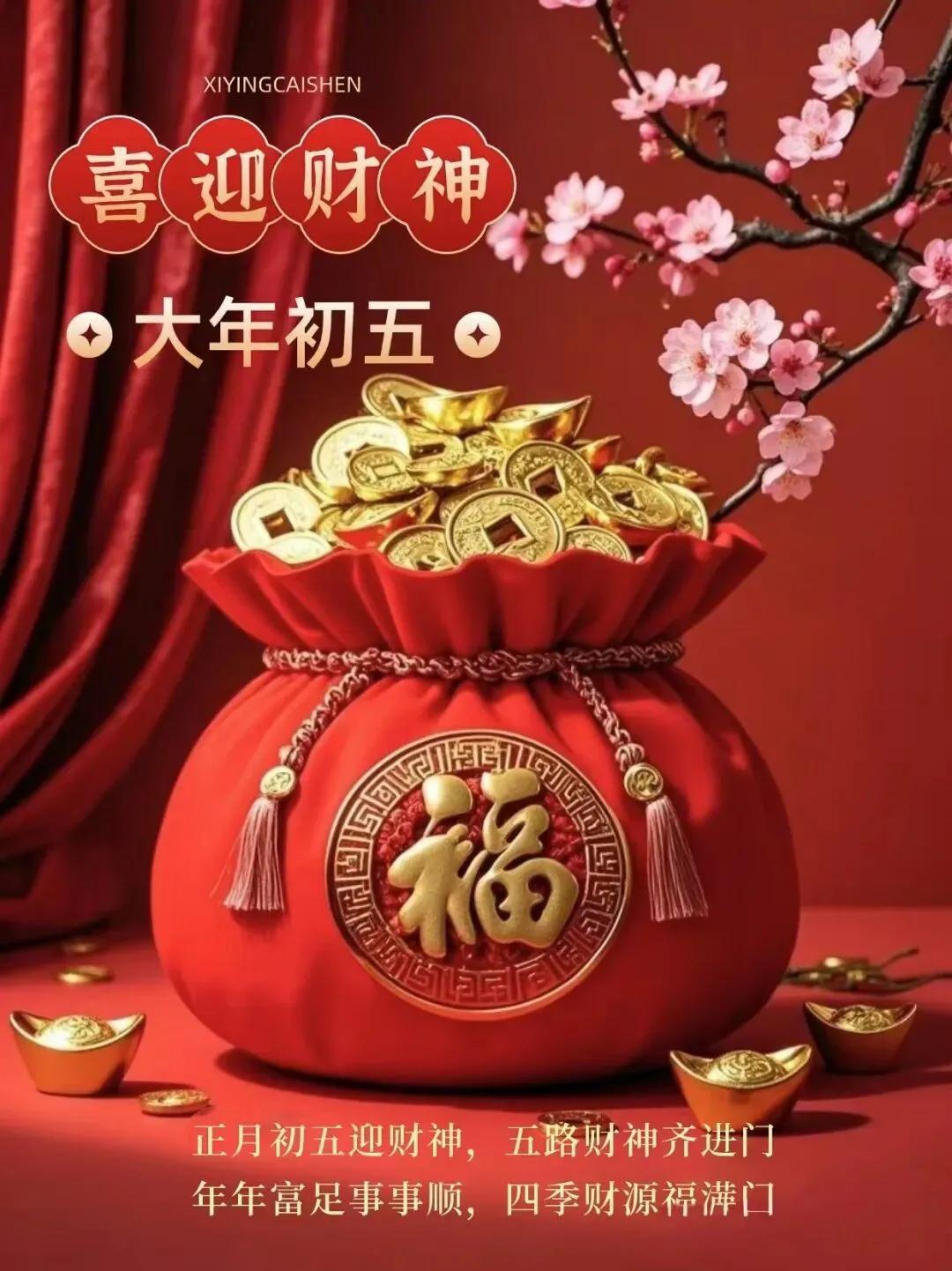 破五開門接神明,財源廣進滿門庭,金光閃閃耀前程,富貴榮華伴此生,願你事業攀高峯,好運連連步步贏,家庭和睦福氣深,身體康健壽長青,初五送上真誠祝,一生順遂喜盈盈。早安,大年初五快樂,新春安康~