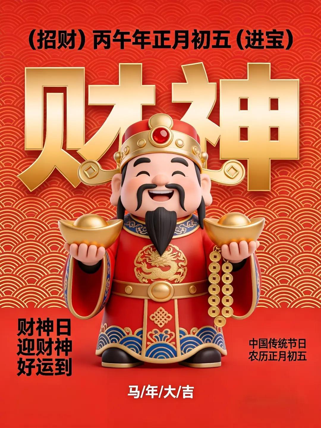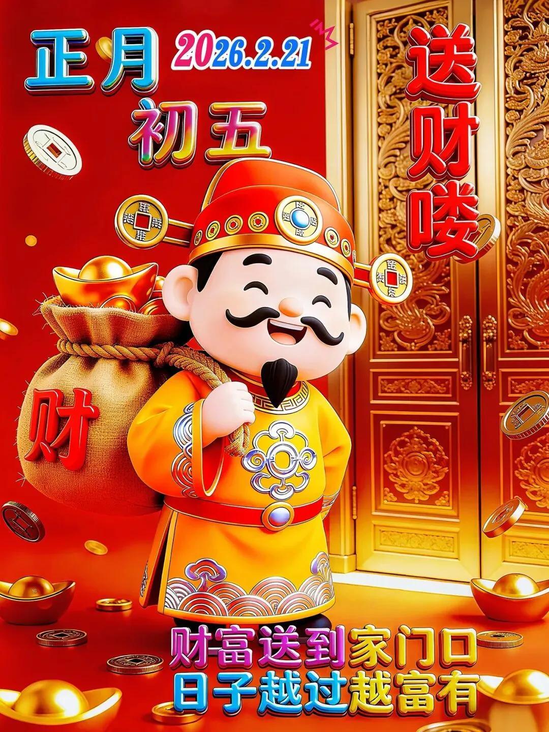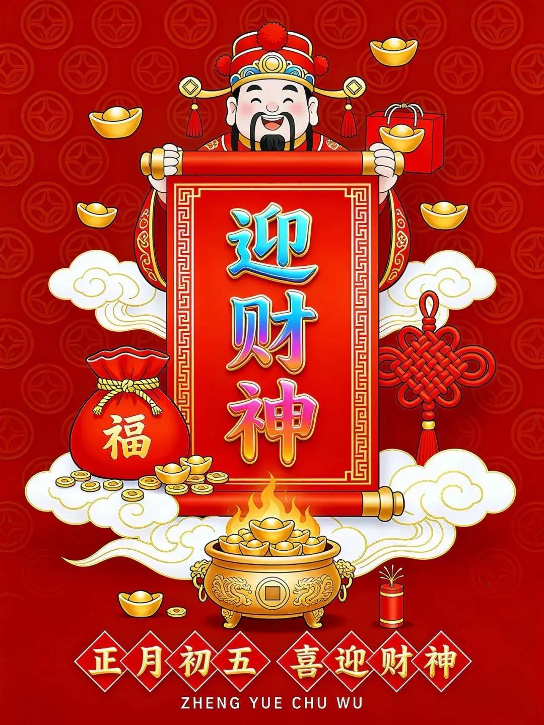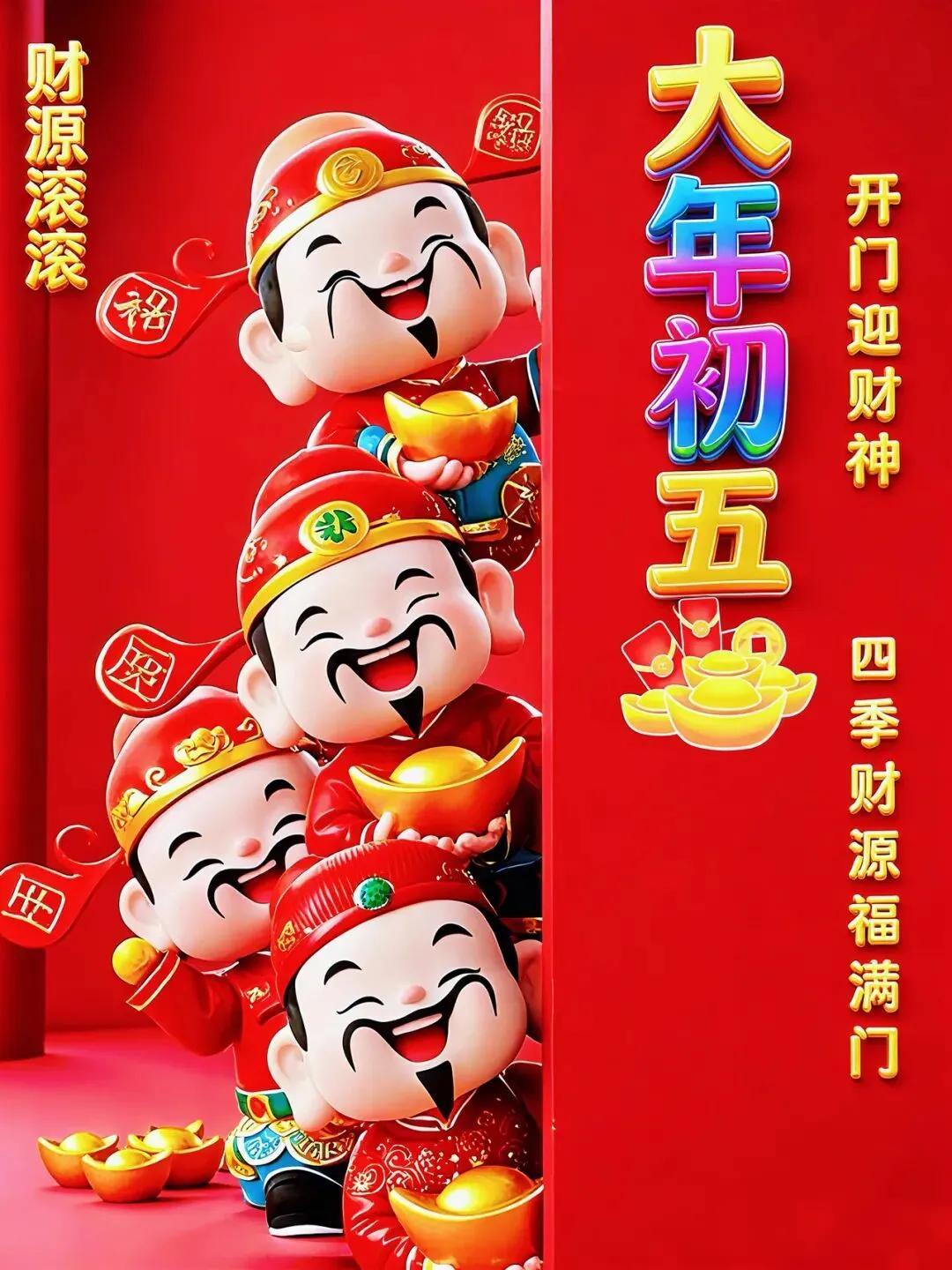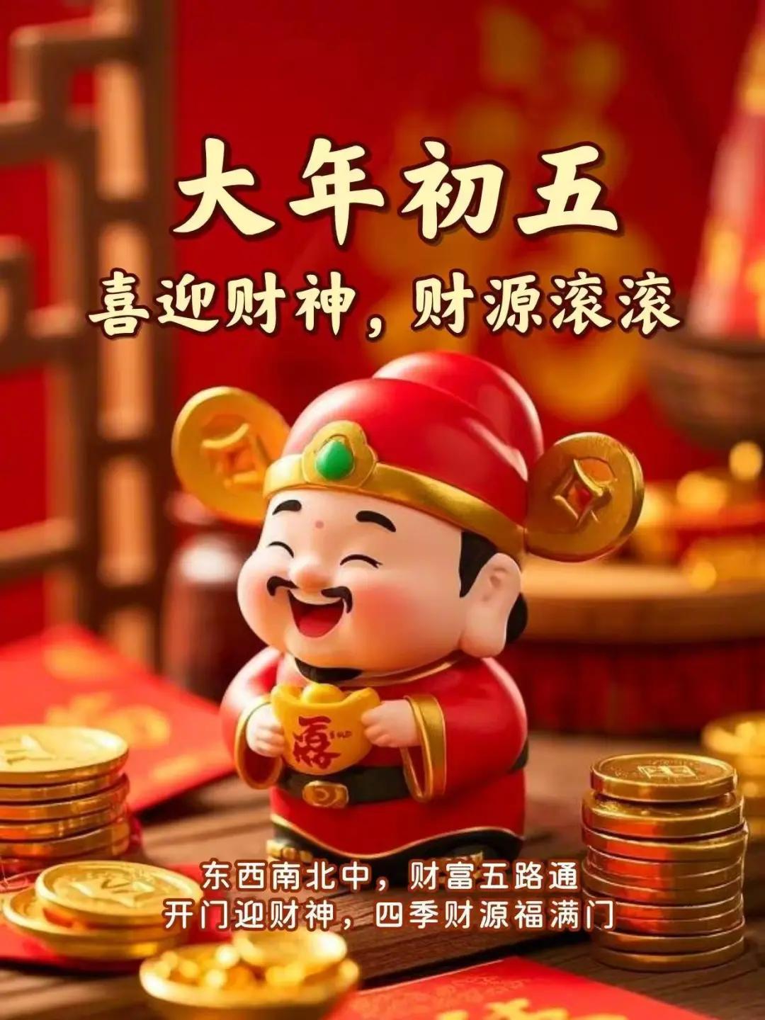 正月初五迎財神,願你新的一年裏事業有成、財運亨通,步步高昇、福星高照。家庭和睦、幸福美滿,身體健康、萬事如意。❤️