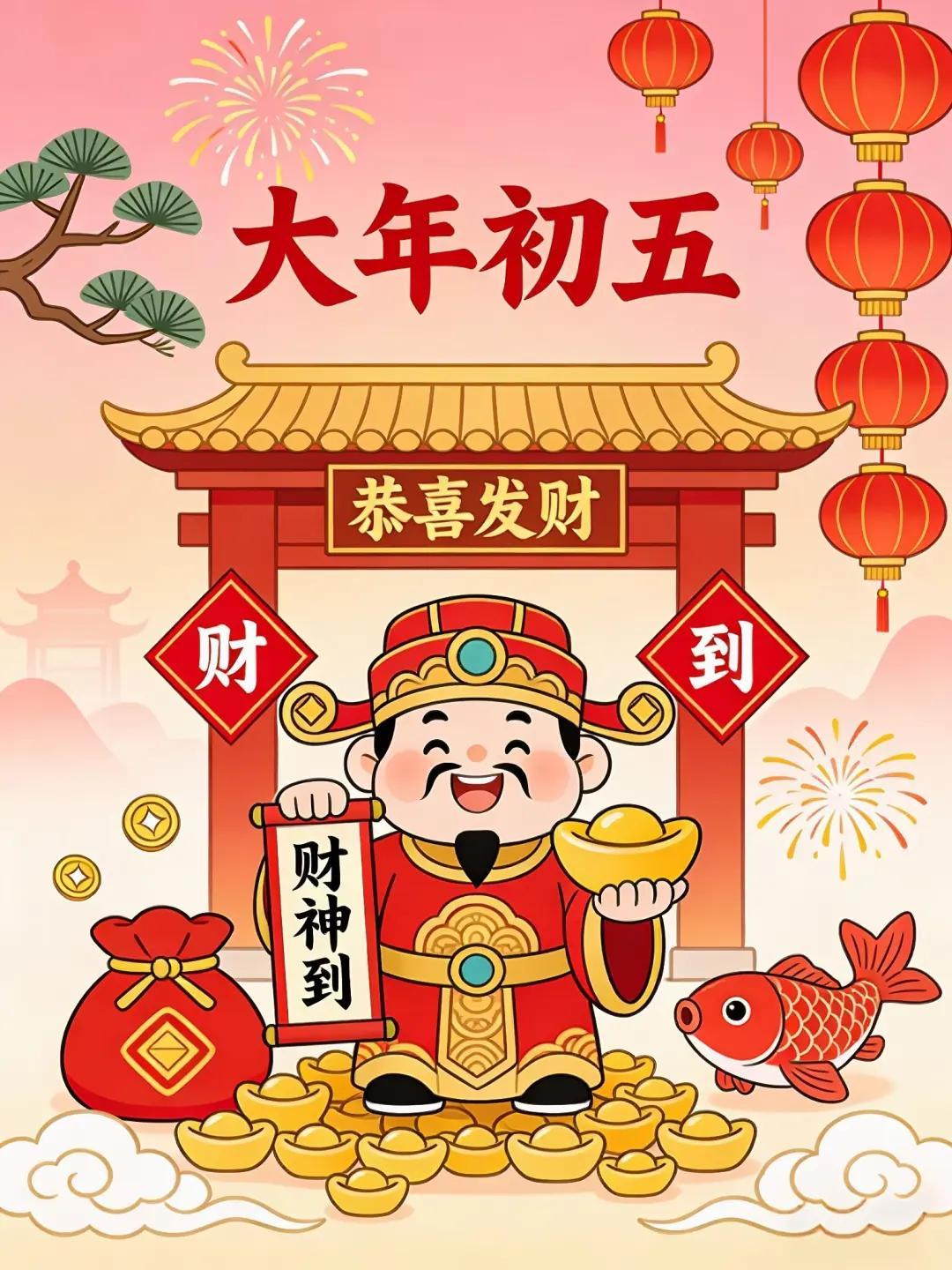 大年初五,財神光臨,萬事亨通,好運常伴!願您在新的一年裏,財運亨通,工作順利,家庭幸福,心想事成!祝您財源滾滾,快樂安康,財神爺帶來滿滿的好運!