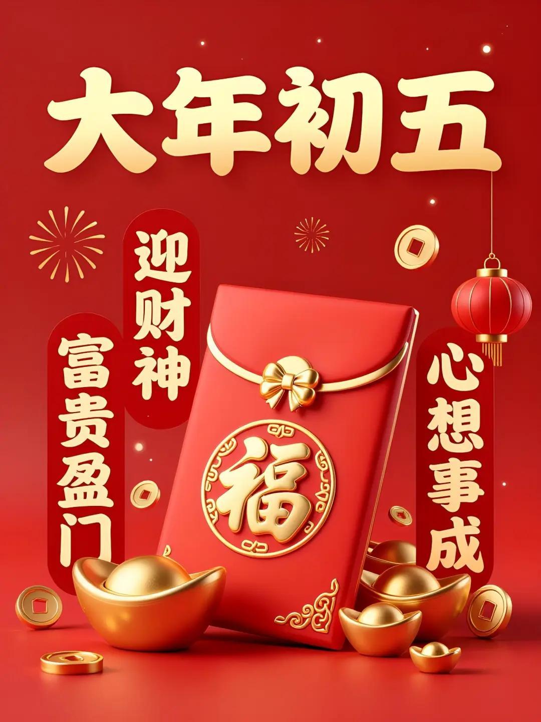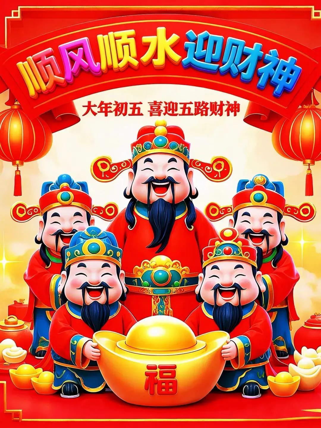 初五接財神,好運伴你行!願你新的一年事業紅紅火火,生活幸福美滿,健康平安無憂,笑容燦爛如花。祝你新年快樂,財源滾滾,萬事如意!