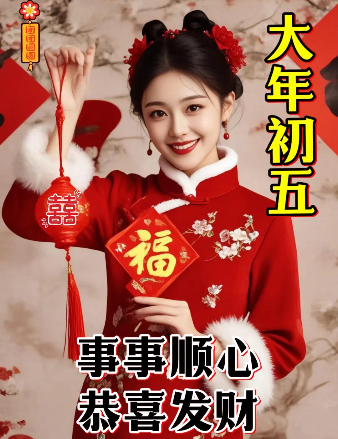 大年初五,財神進門,年年順意,歲歲安康!大年初五迎財神,財運亨通事事順,心想事成福滿門,紅紅火火過年!幸福日子步步高!財運滿滿樂開懷!