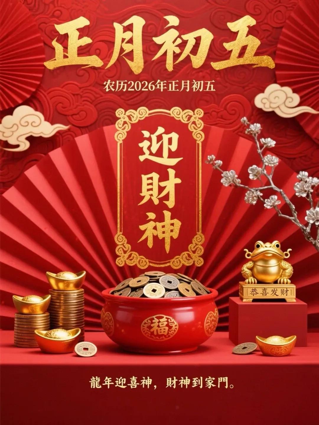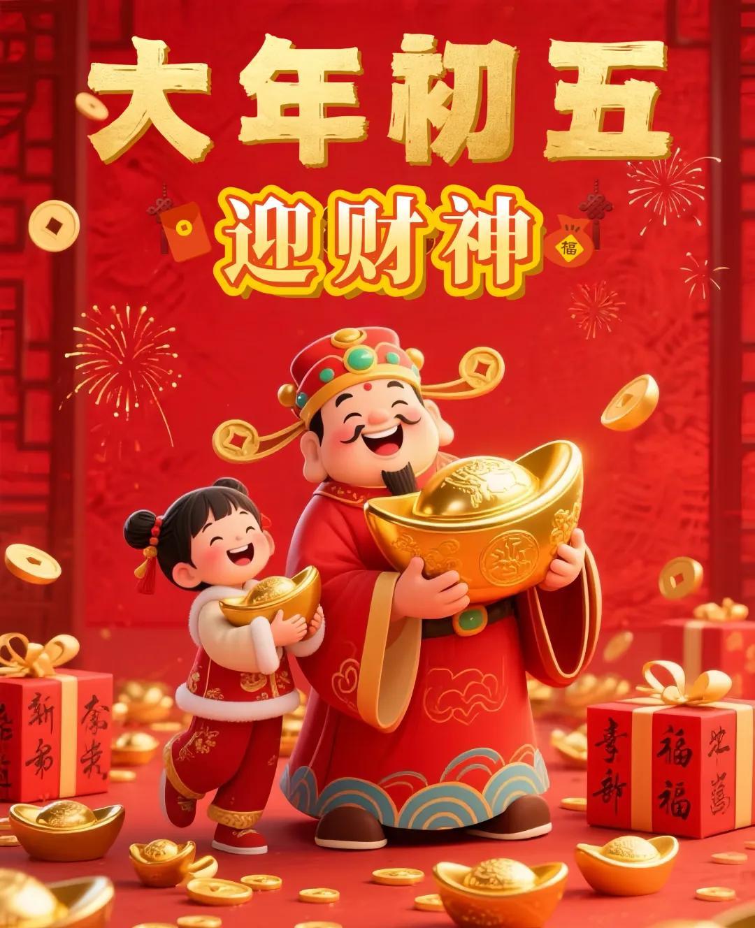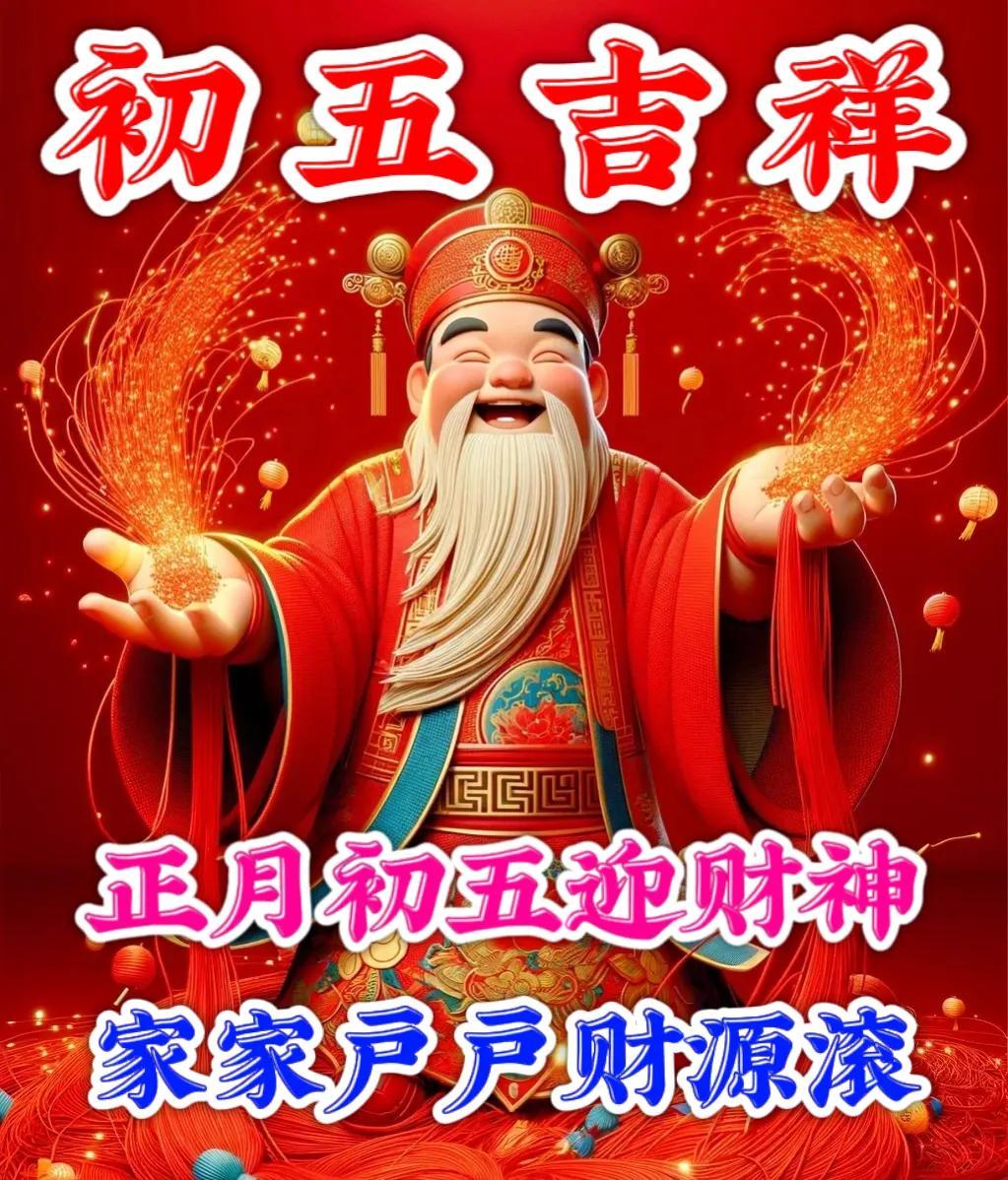 正月初五喜迎財神東財西財,南北通財,金銀滿財,富貴添財,順心聚財,平安旺財,開開心心發財,順順利利得財,健健康康守財,紅紅火火旺財。初五早安!
