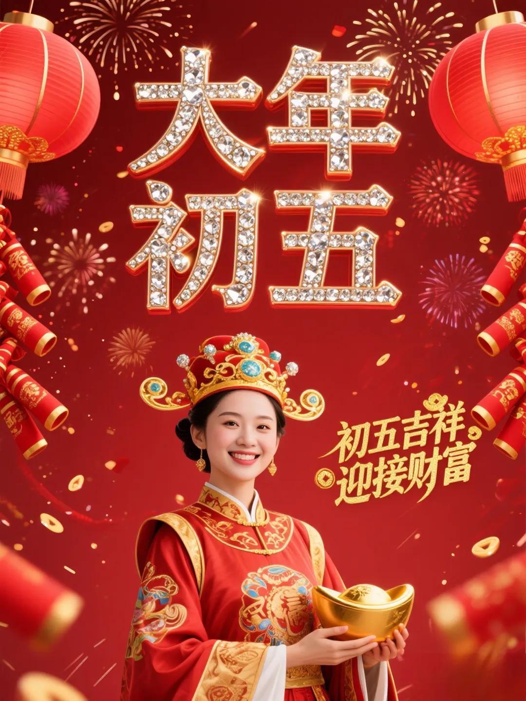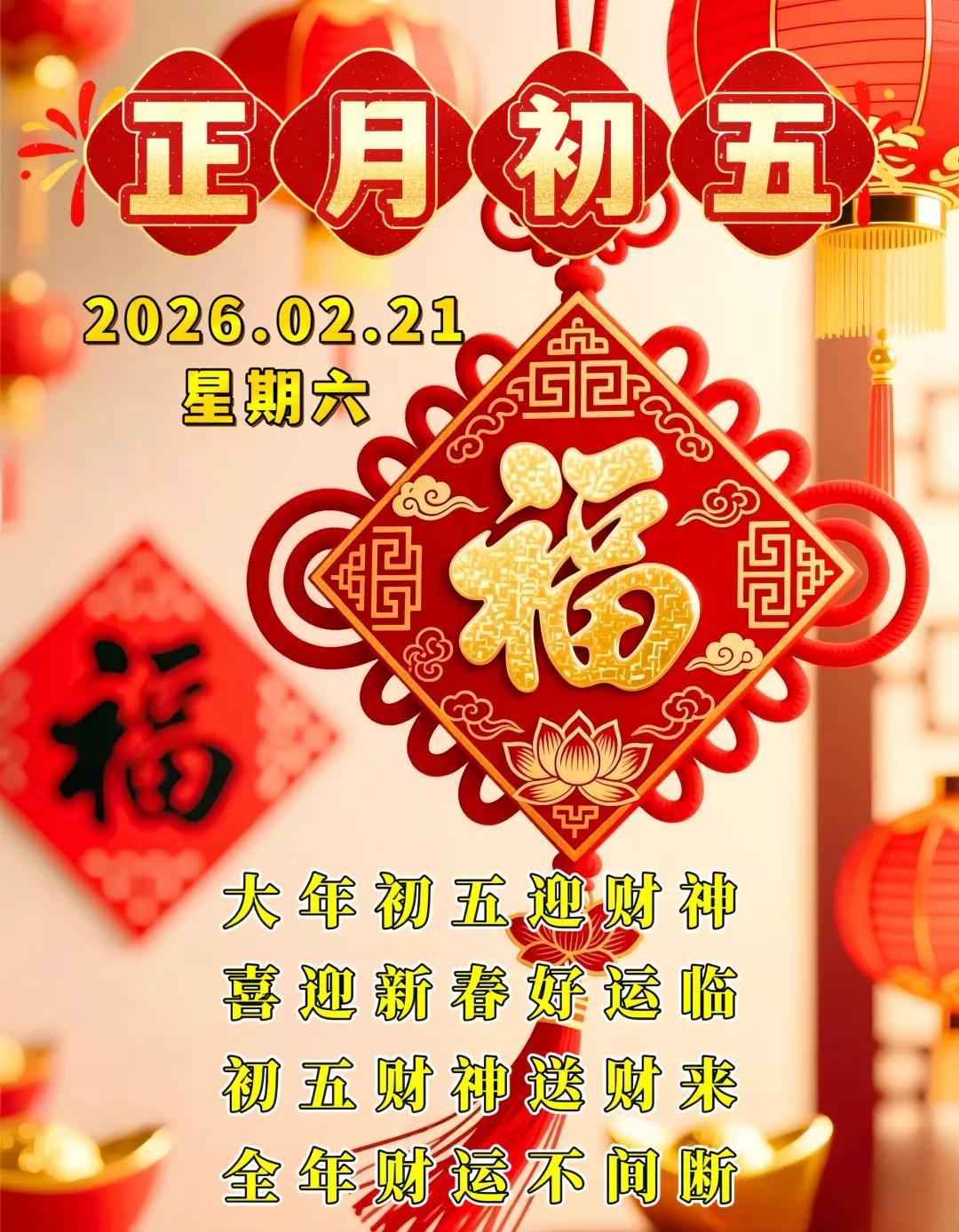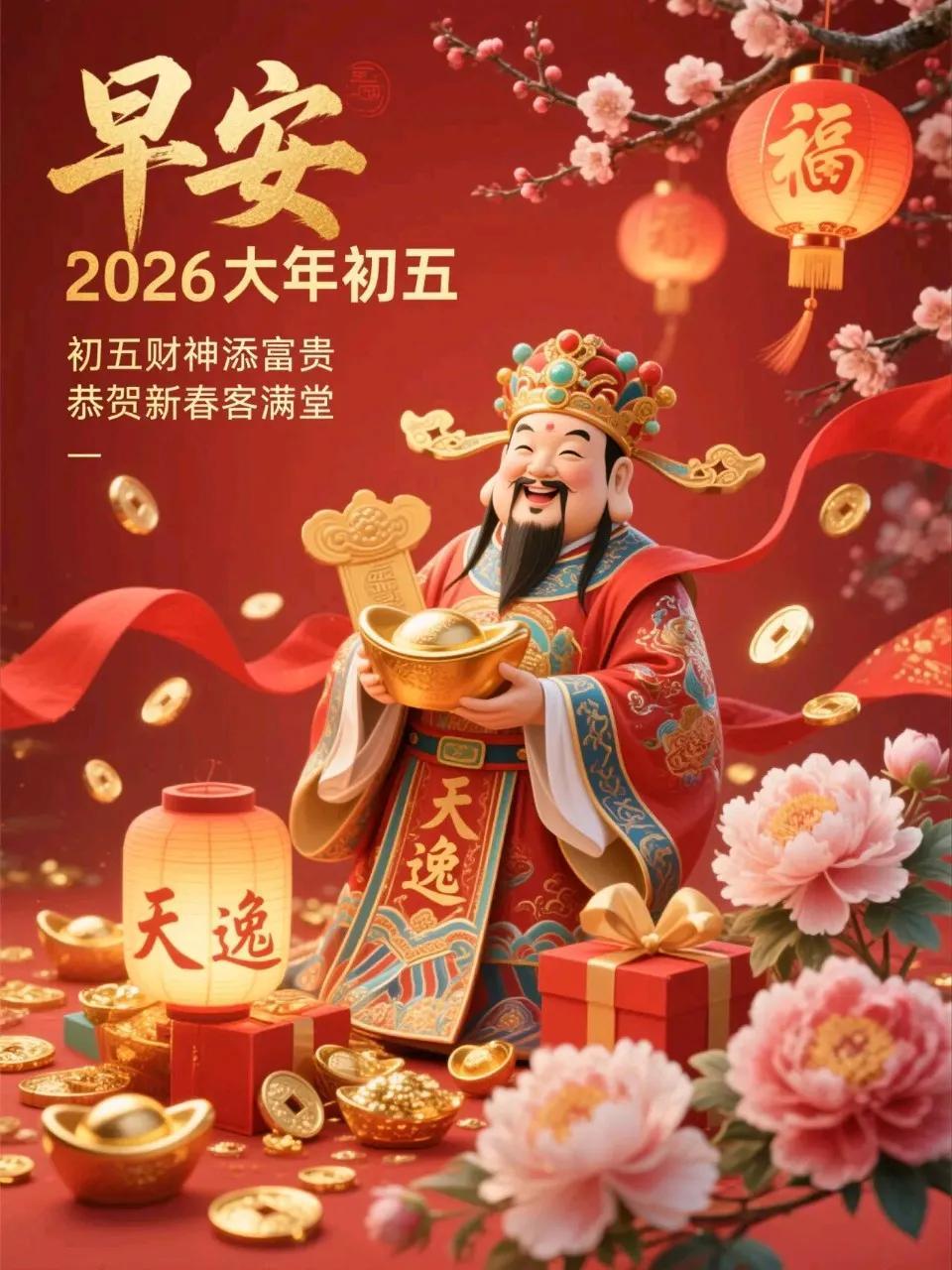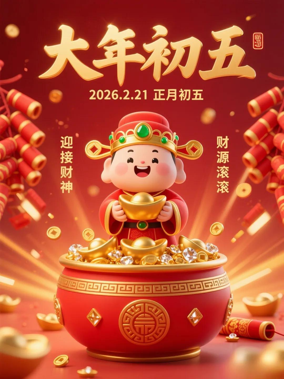 正月初五喜迎財神東財西財,南北通財,金銀滿財,富貴添財,順心聚財,平安旺財,開開心心發財,順順利利得財,健健康康守財,紅紅火火旺財。初五早安!