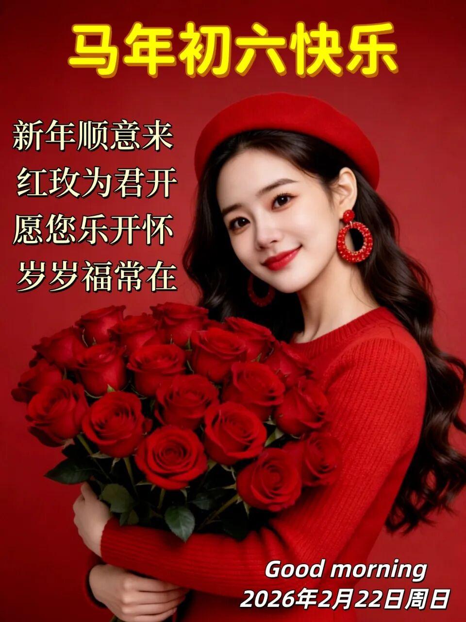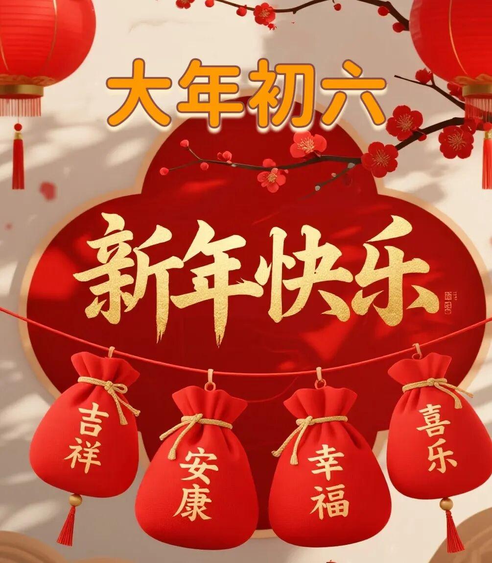 大年初六,送祝福。喜氣洋洋送吉祥,一送,好運不可擋。天天賺錢幸福忙,二送,溫情心中藏。朋友之間莫相忘,三送,福祿與健康。願您身體強又壯,早安快樂!