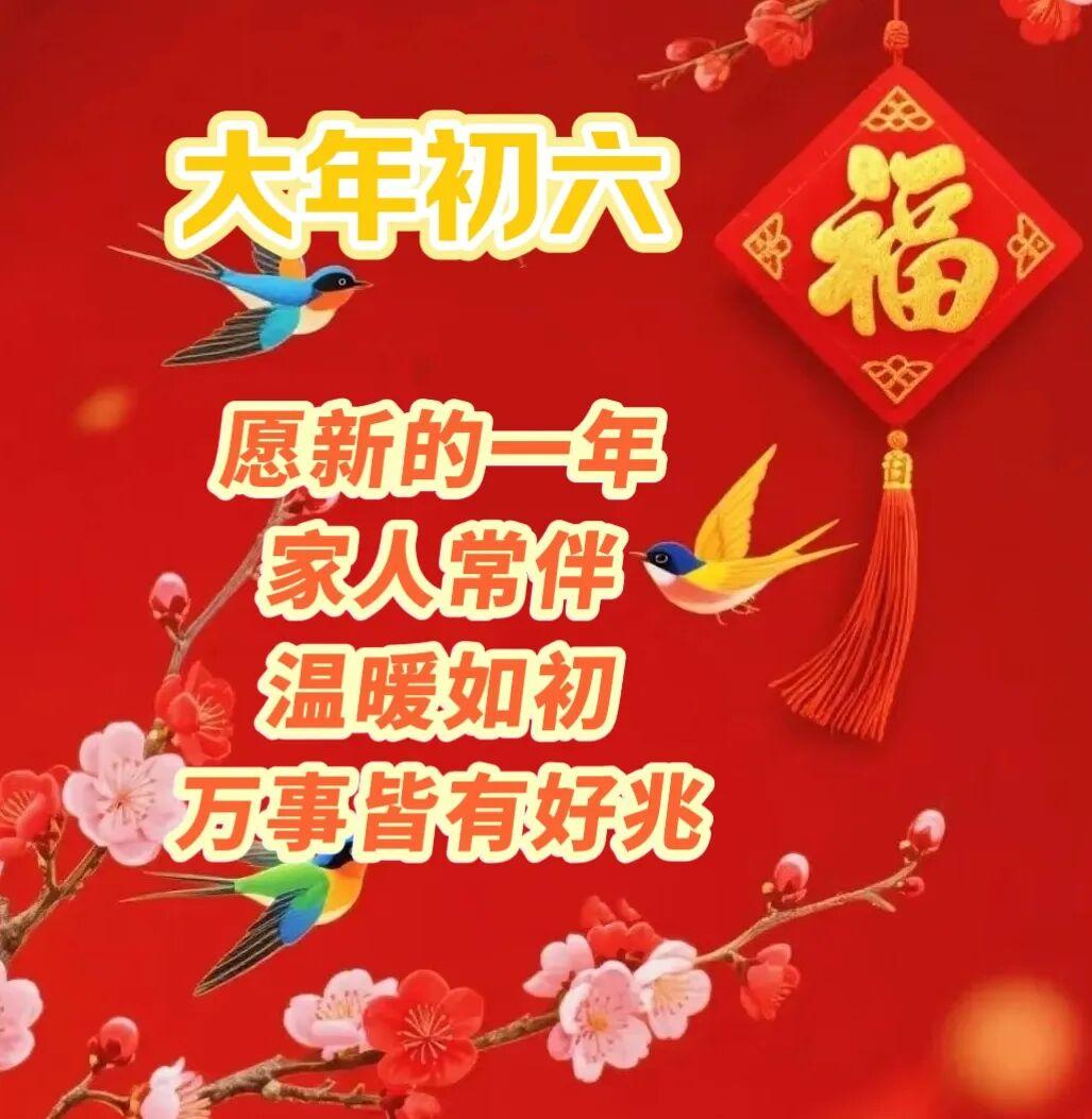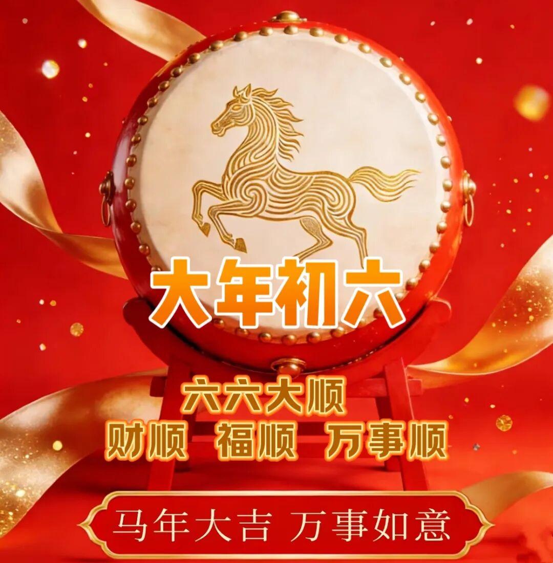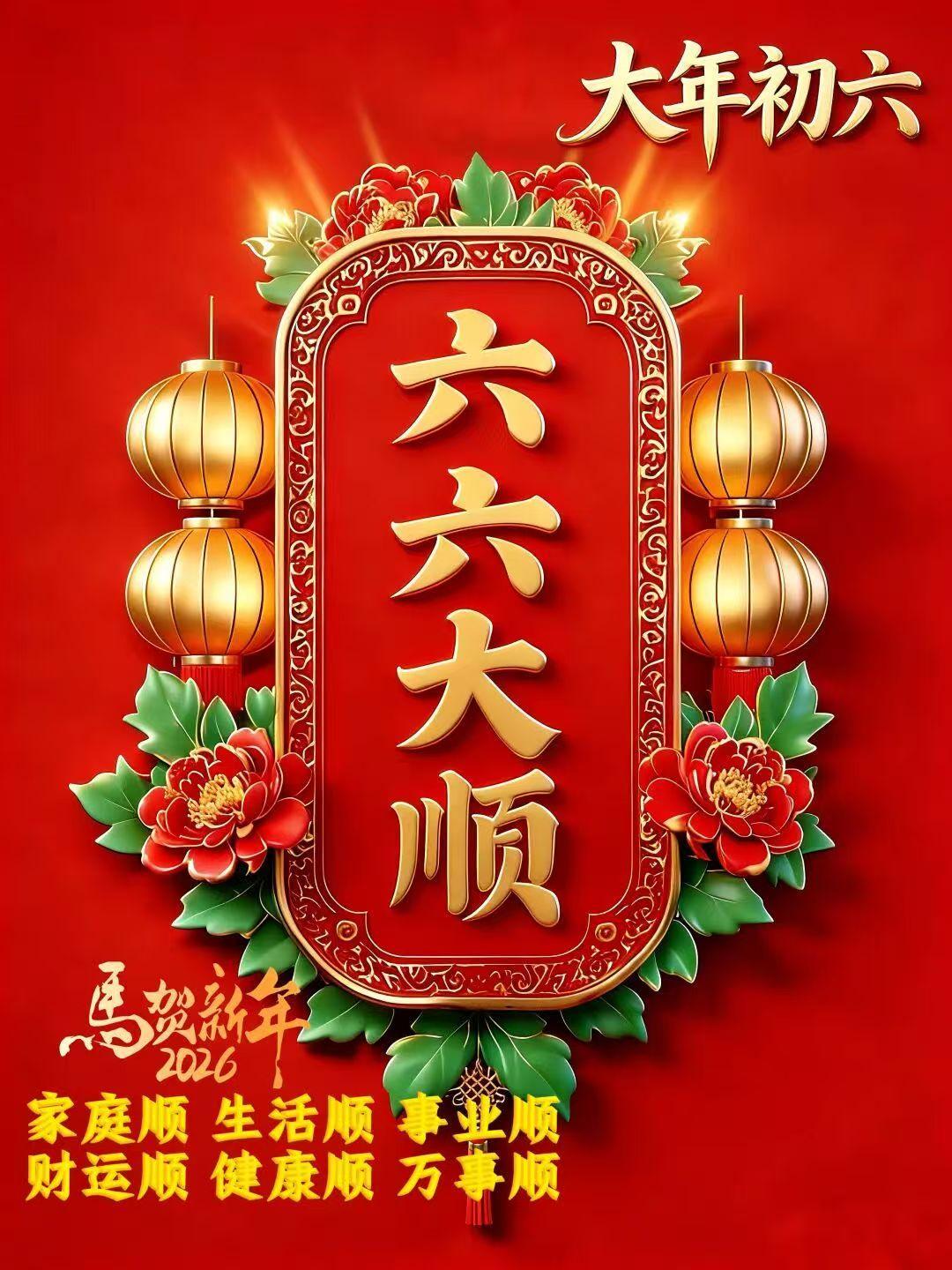 大年初六臨門順;祝你好運六六順;一祝工作事業順;二祝幸福家庭順;三祝成績學業順;四祝加薪財運順;五祝身體健康順;六祝和睦鄰里順。早安吉祥!