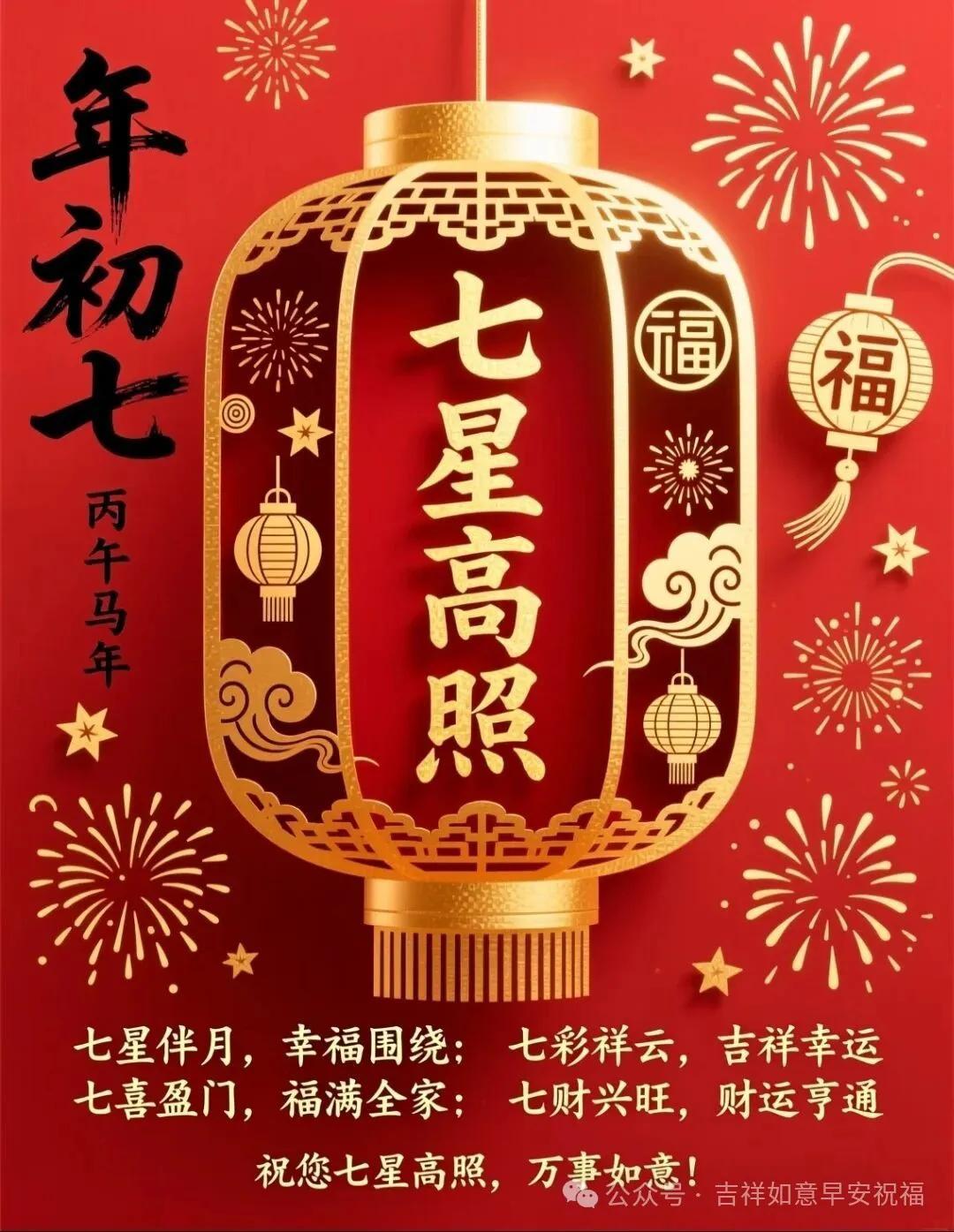 正月初七,七星高照。最美福語送到,願您:七星伴月,福運環繞;七竅玲瓏,智慧浩渺;七步成章,才思清妙;七彩祥雲,祥瑞相照;七彩人生,斑斕多嬌;駿馬騰飛,宏圖盡描;七星高照,福滿今朝。祝您新春歡暢,馬年吉兆!