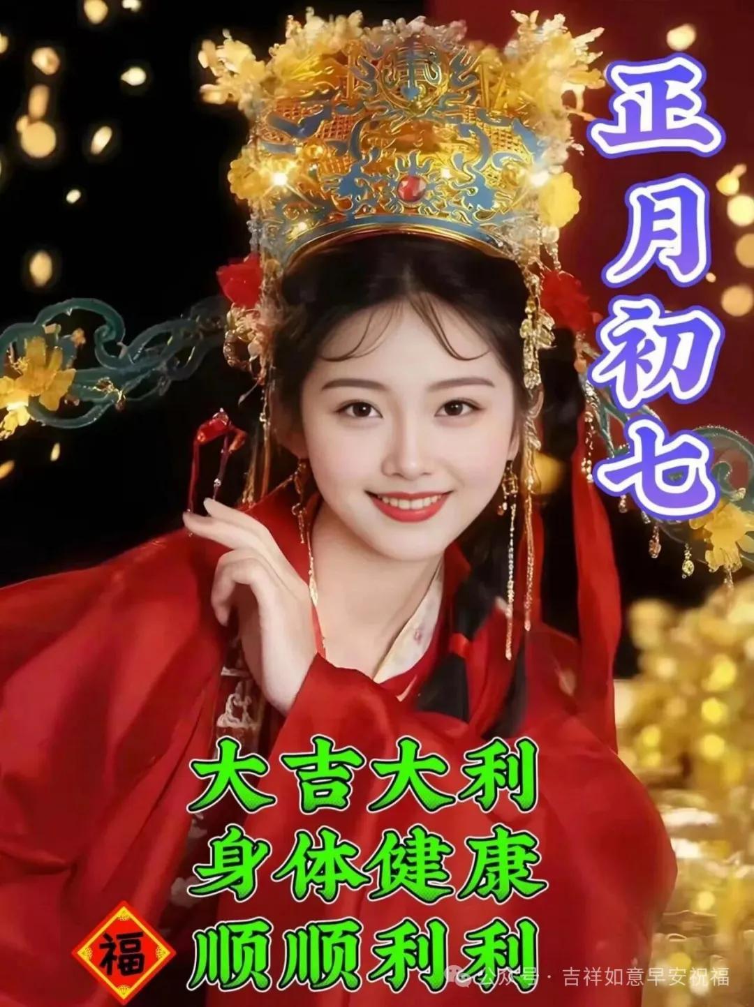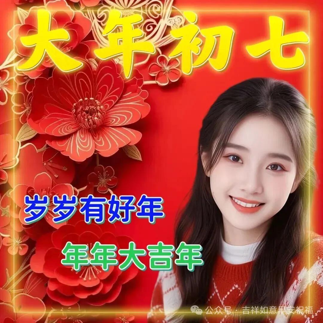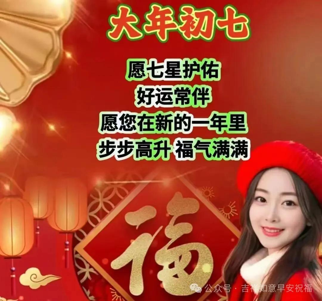 年初七,道安康,遇事樁樁順,日子節節揚,福運朝朝降,越活越鮮亮,家中聚金玉,案上積錢糧。馬年時時皆歡暢!