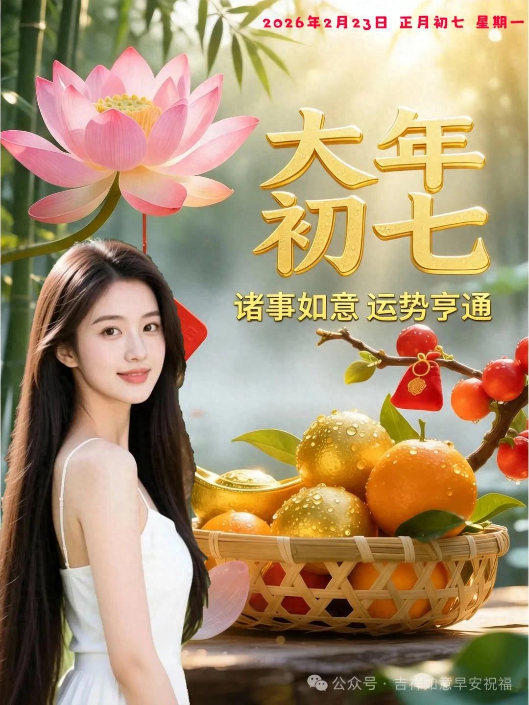 初七臨,瑞氣臨,福運臨,幸福隨身印。納福聚財家宅興,祥雲繚繞福星近。坦途邁步如舟順,心悅神安福韻沁。初七吉言贈予您,新年圓滿又暖心。